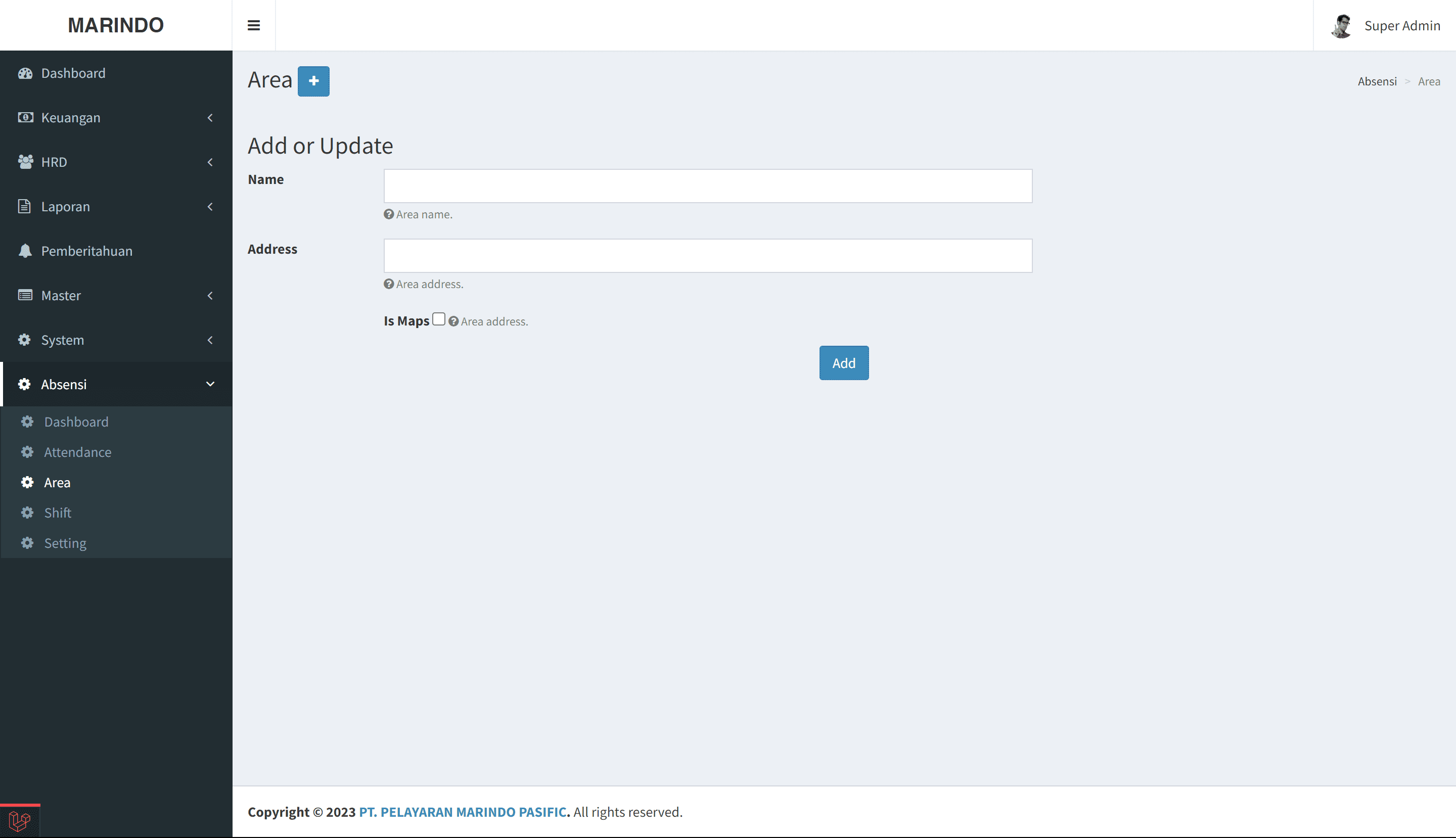 Pada form tambah area silahkan memasukkan data Name, Address dan tekan tombol Simpan