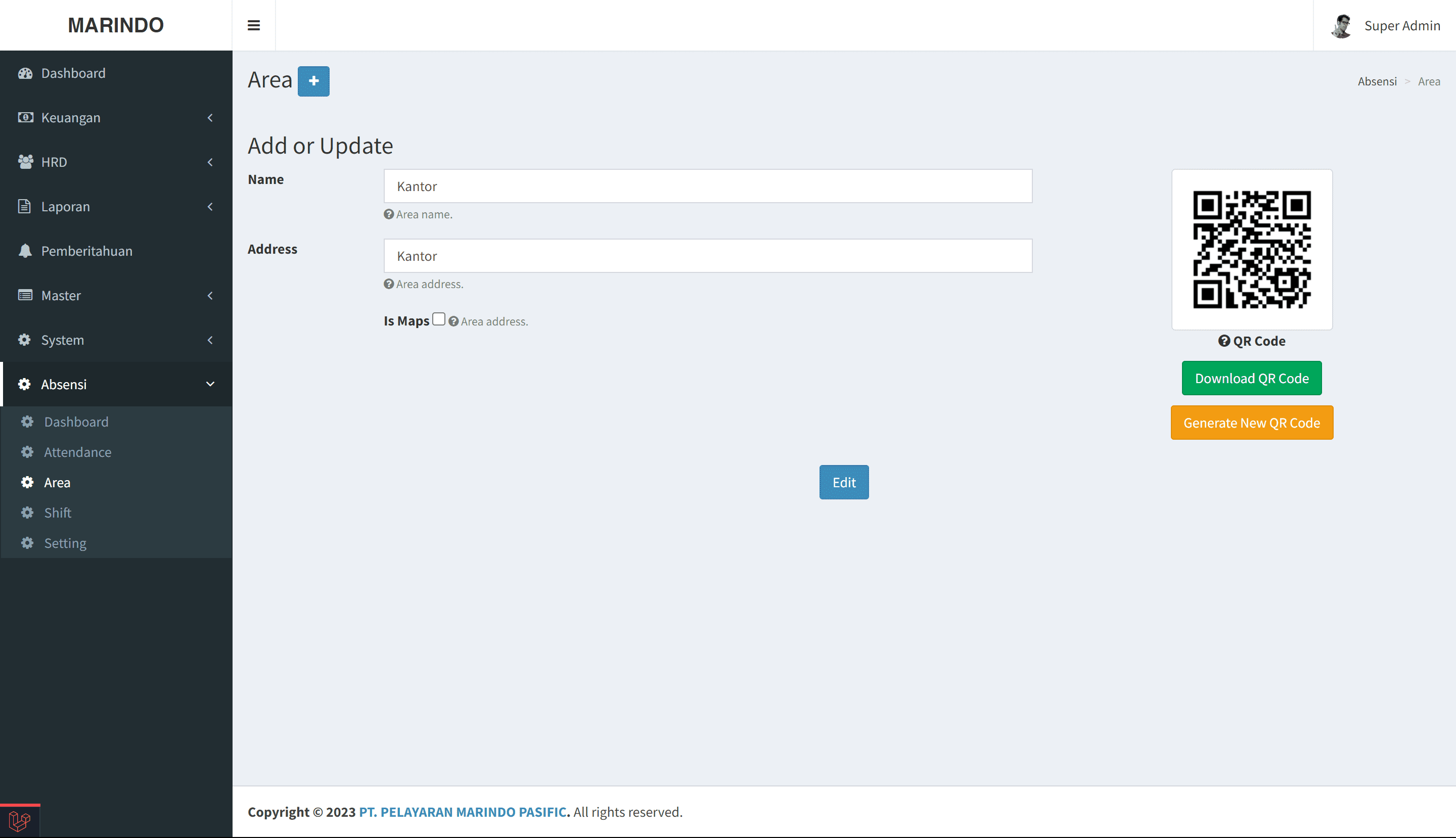 Pada form edit area silahkan ubah data Name, Address dan tekan tombol Simpan