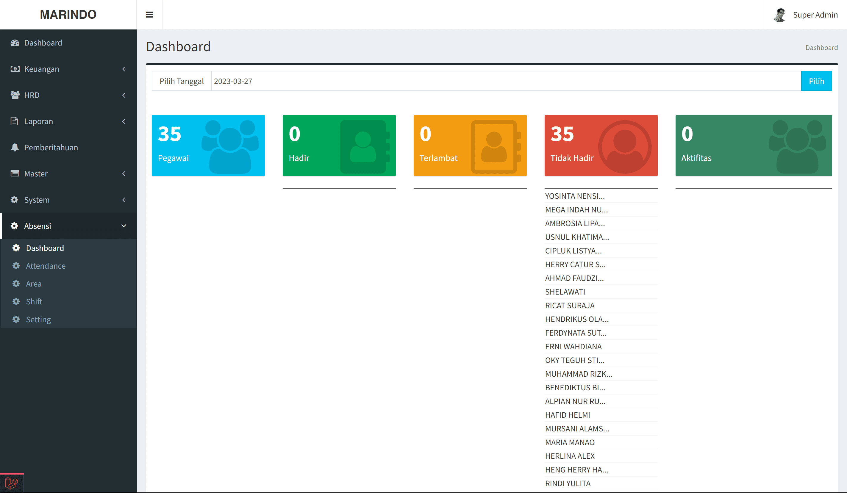 Modul attendance berisi data-data attendance yang terdapat di marindo :