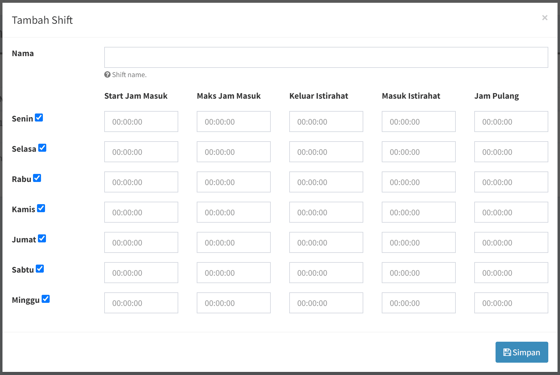 Pada form tambah shift silahkan memasukkan data Nama Shift, Pilih Hari, Start Jam Masuk, Maks Jam Masuk, Keluar Istirahat, Masuk Istirahat, dan Jam Pulang dan tekan tombol Simpan