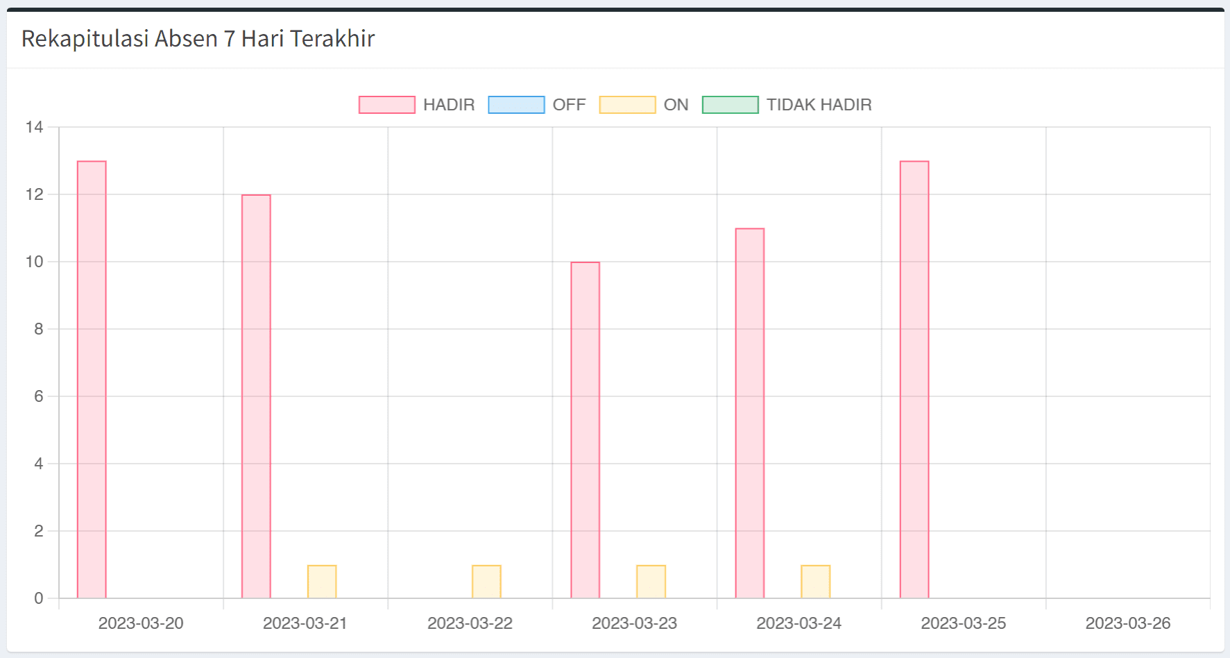 Dashboard absensi berisi rekapan dari data Absensi karyawan setiap harinya, dengan detail data sebagai berikut :