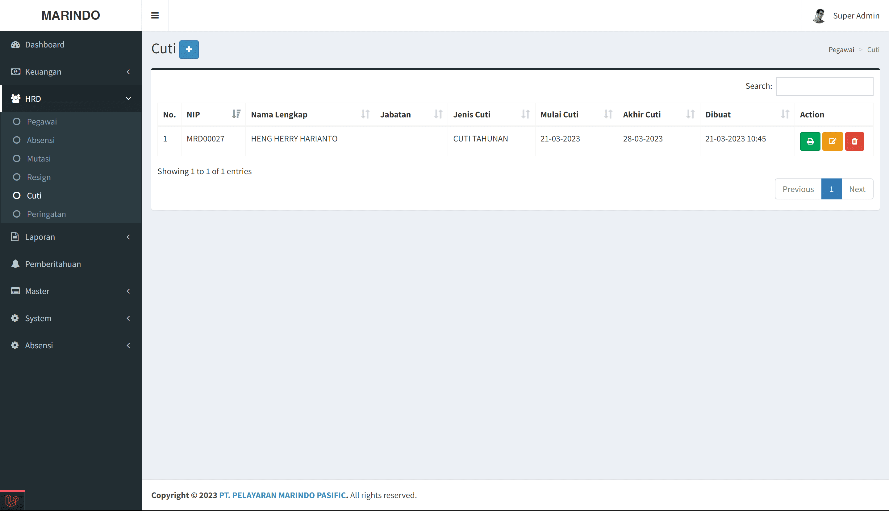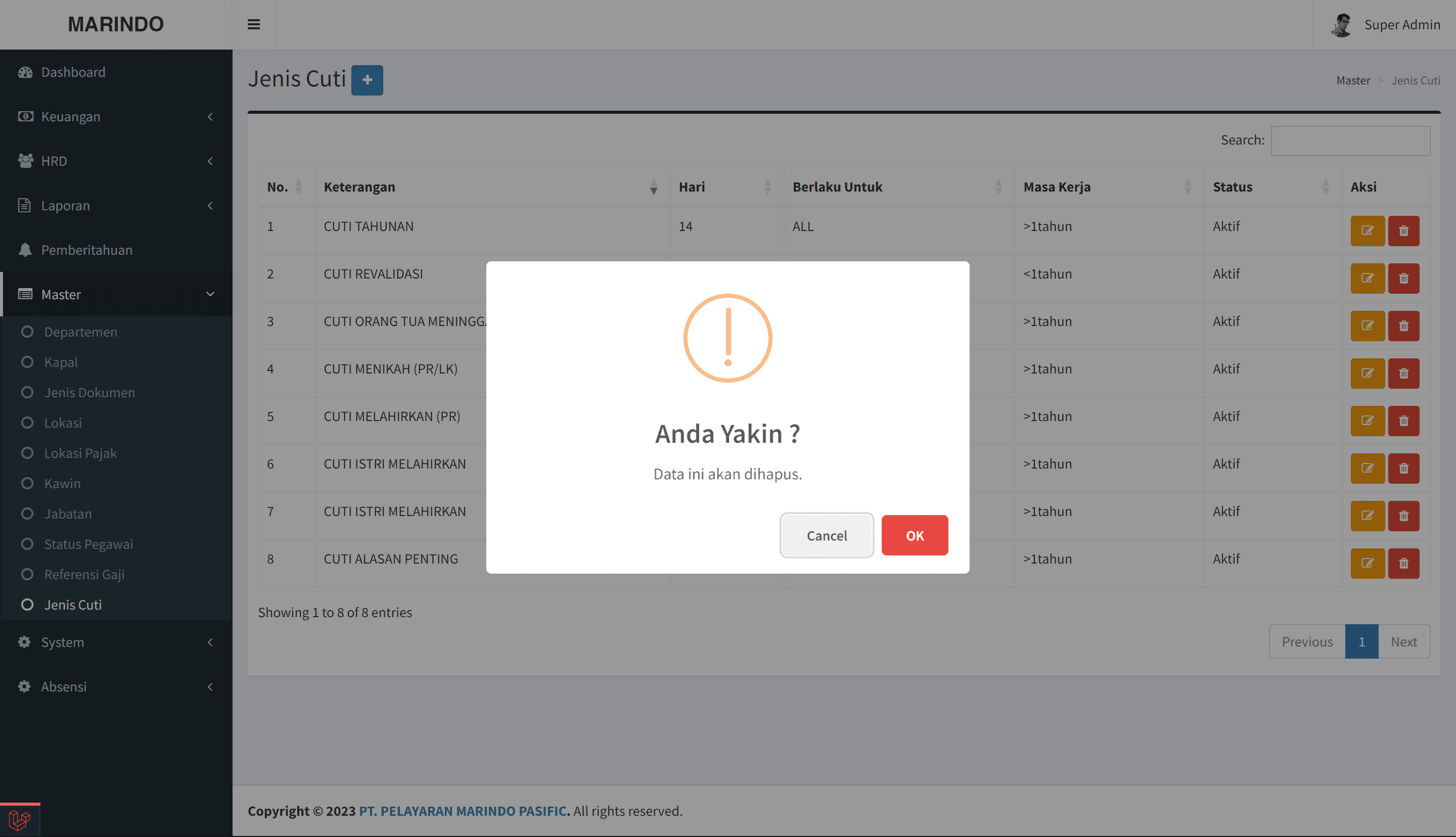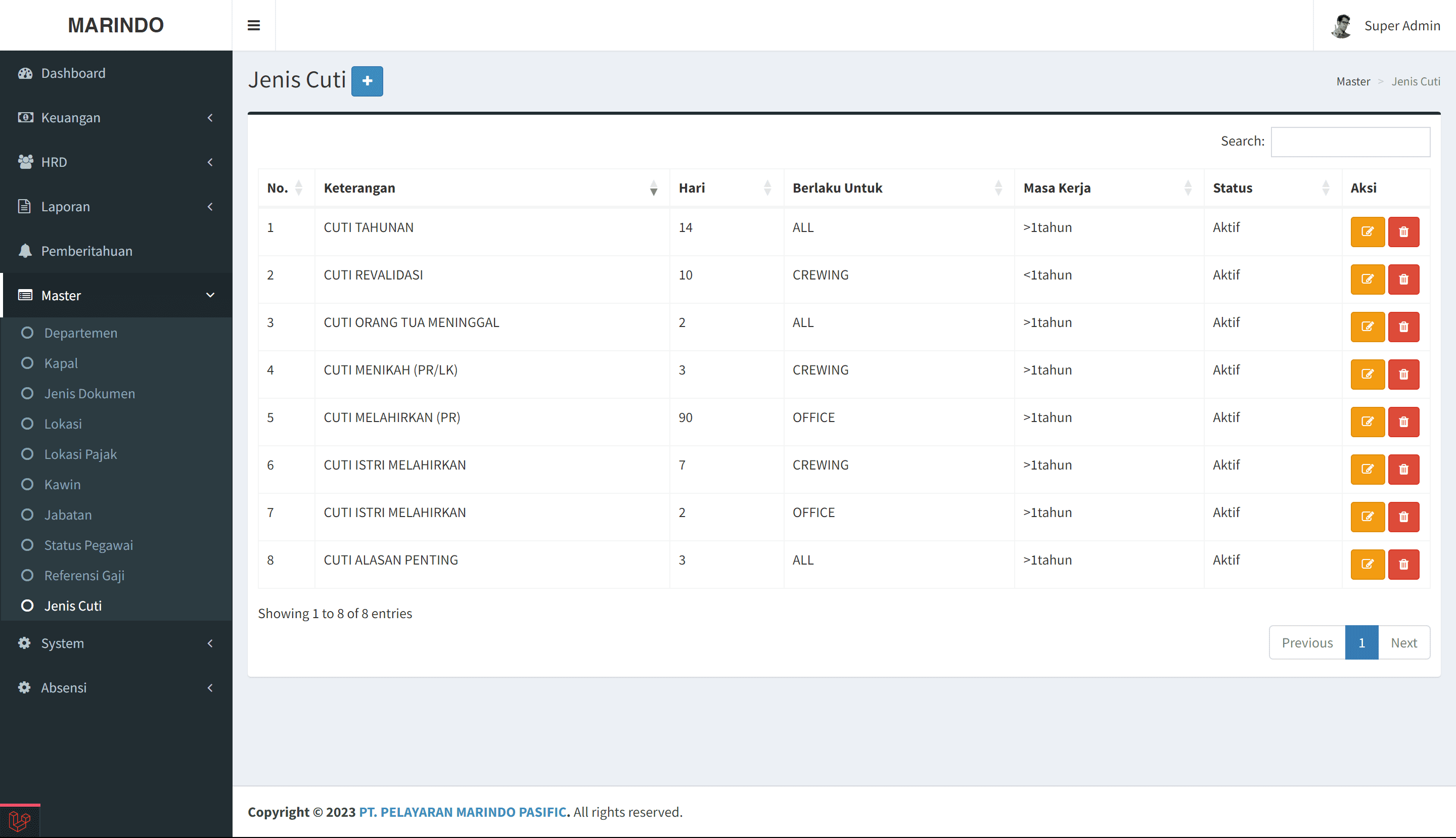 Modul jenis Cuti berisi data-data jenis Cuti yang terdapat di marindo :