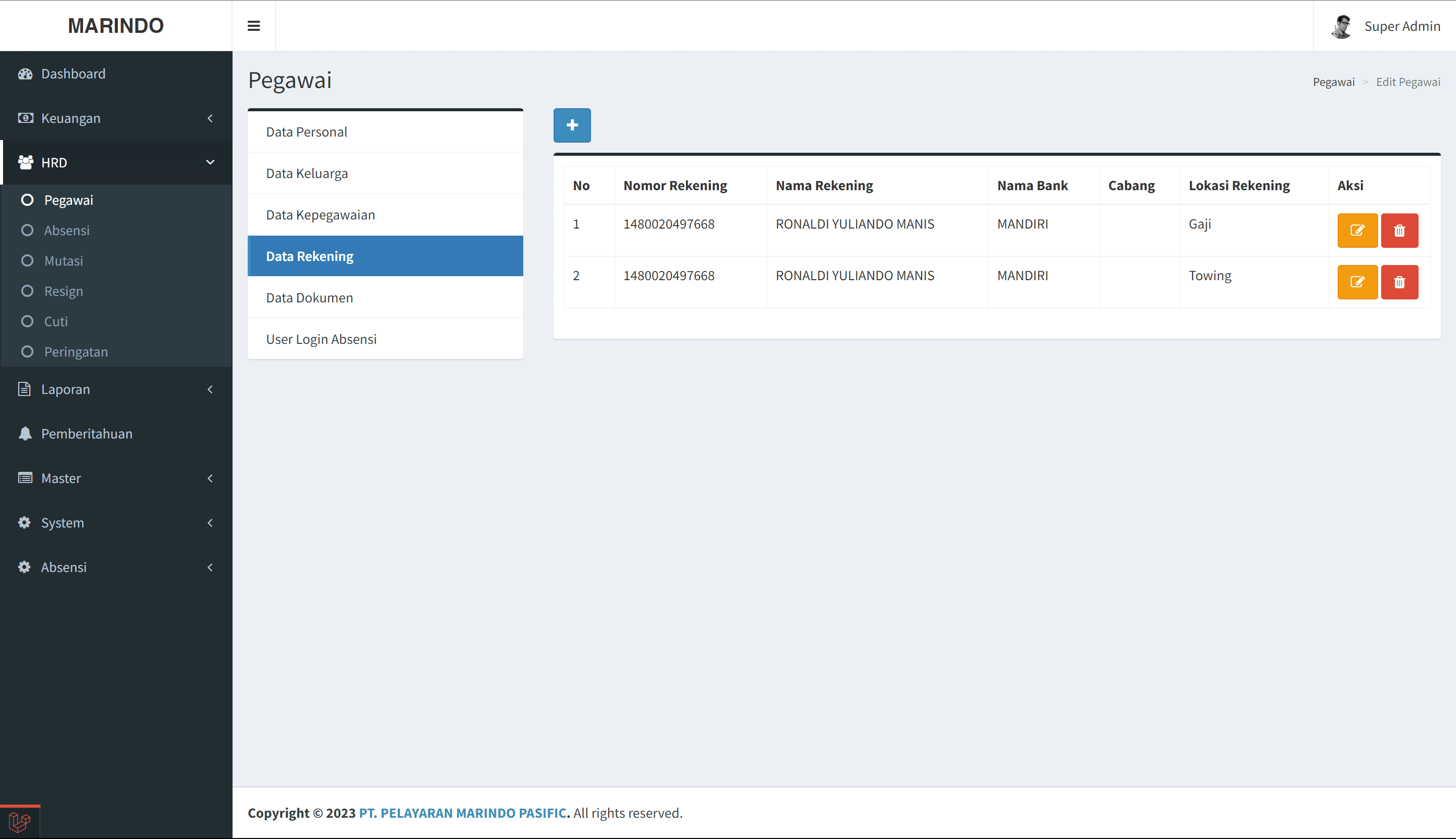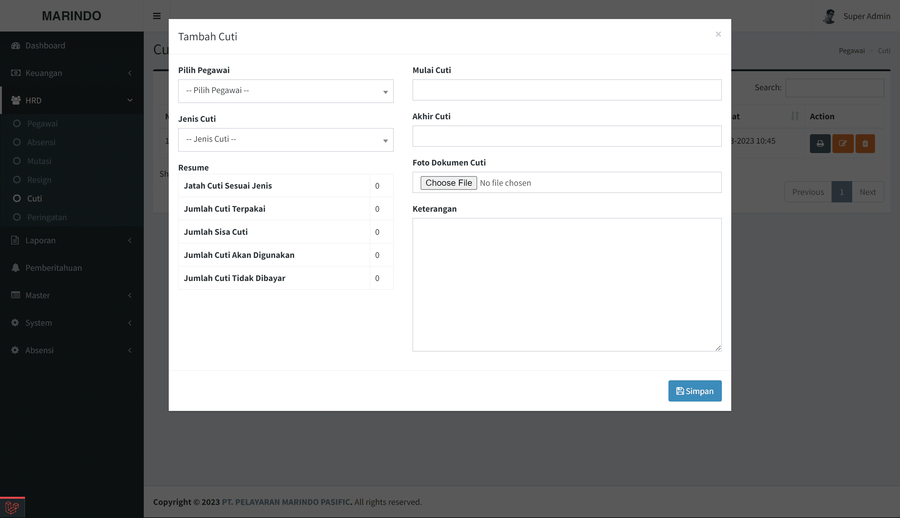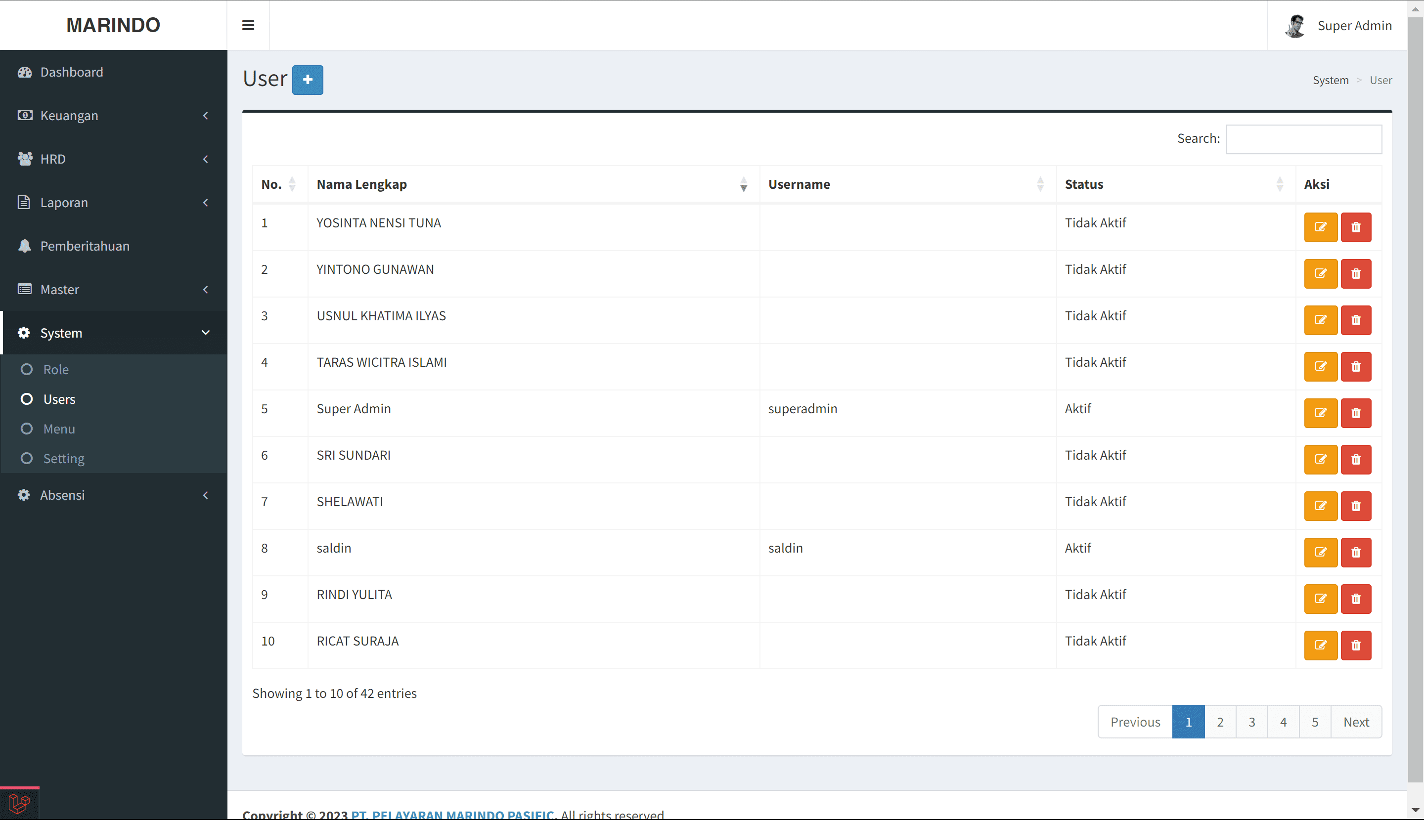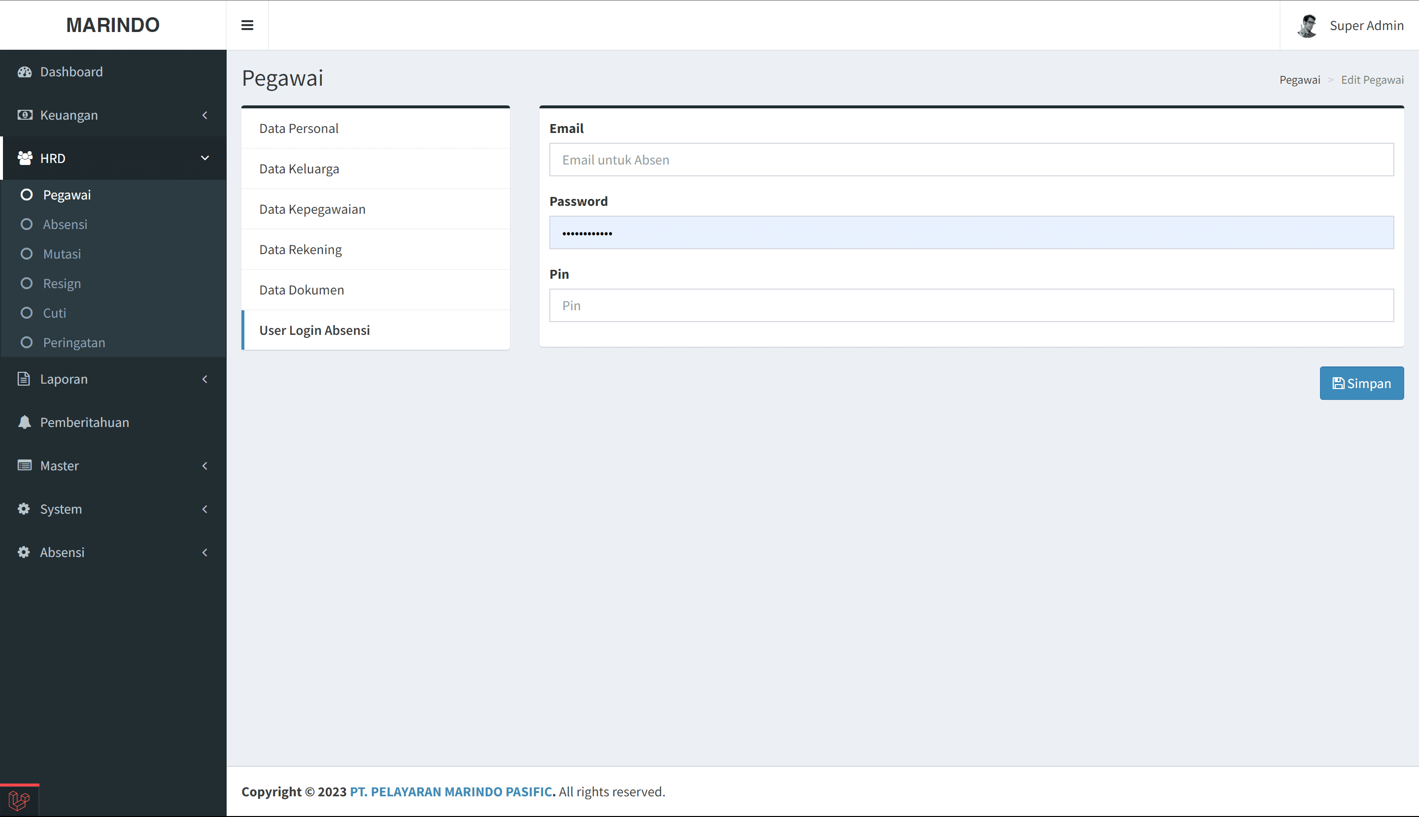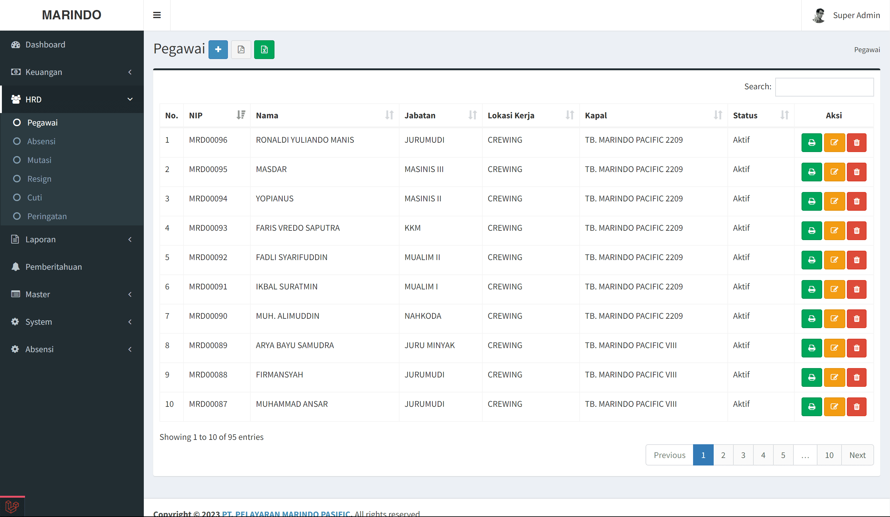 Modul pegawai berisi data-data pegawai yang terdapat di marindo :