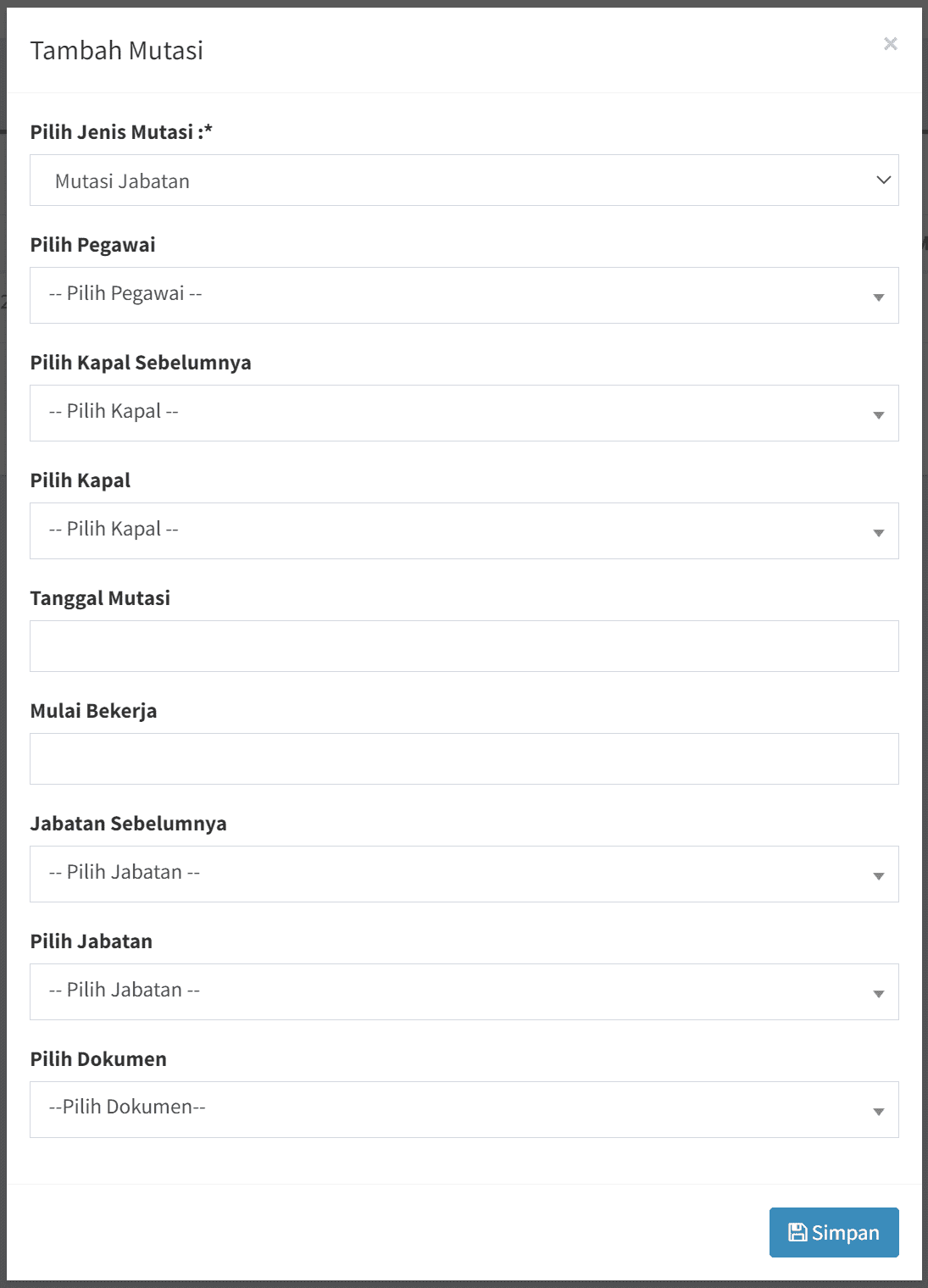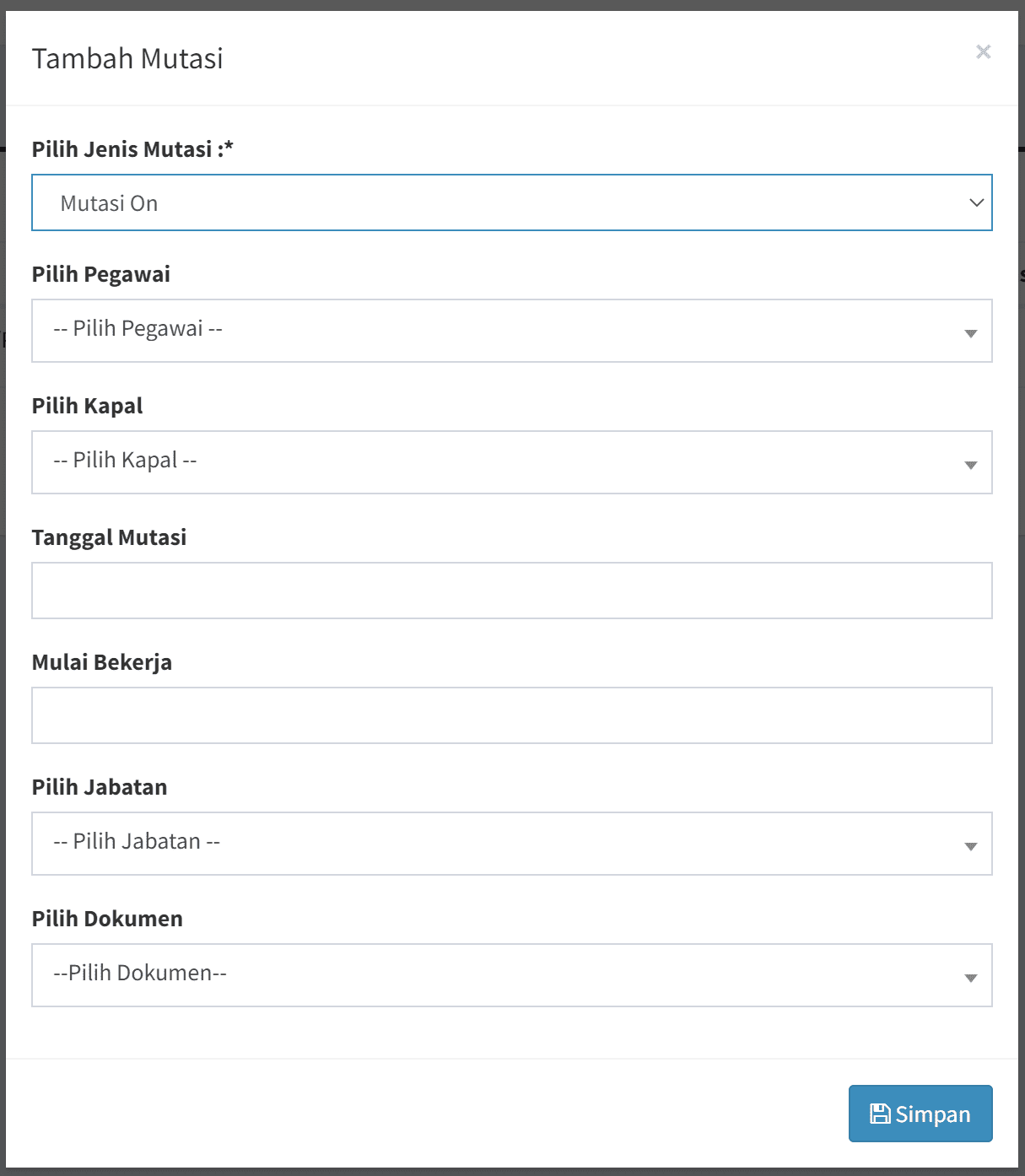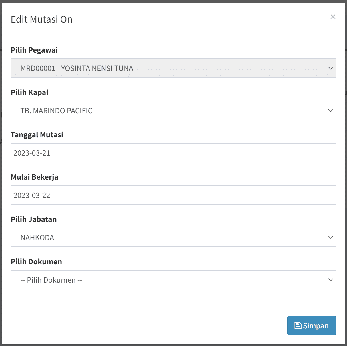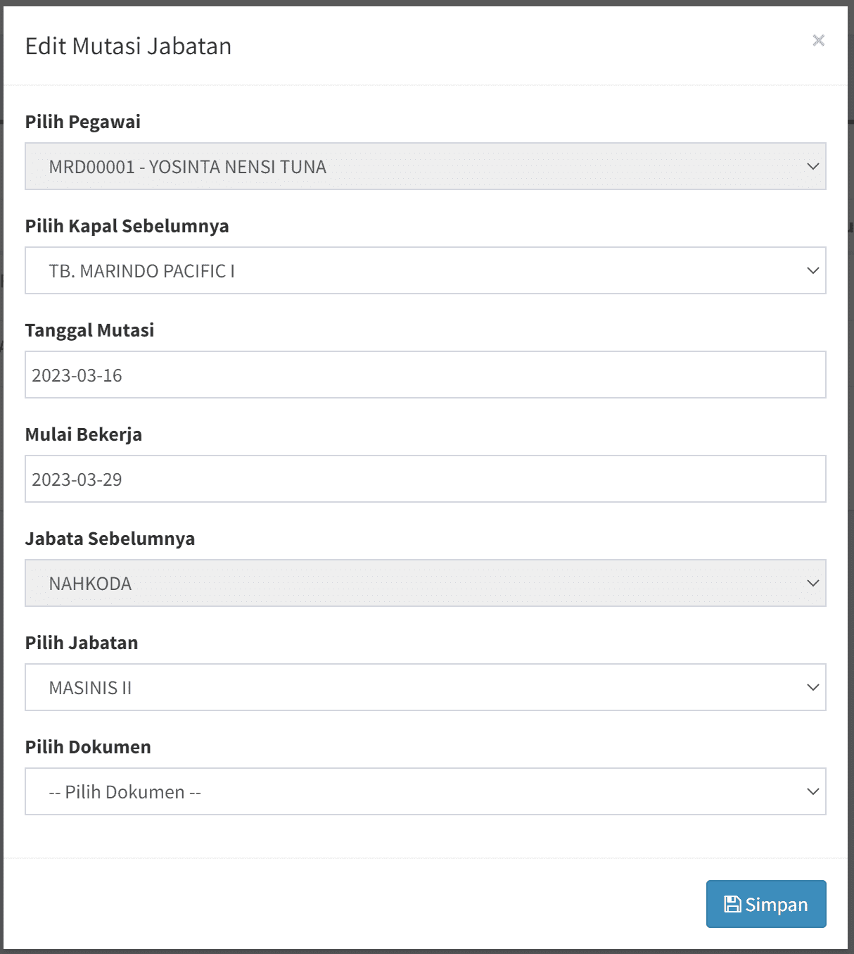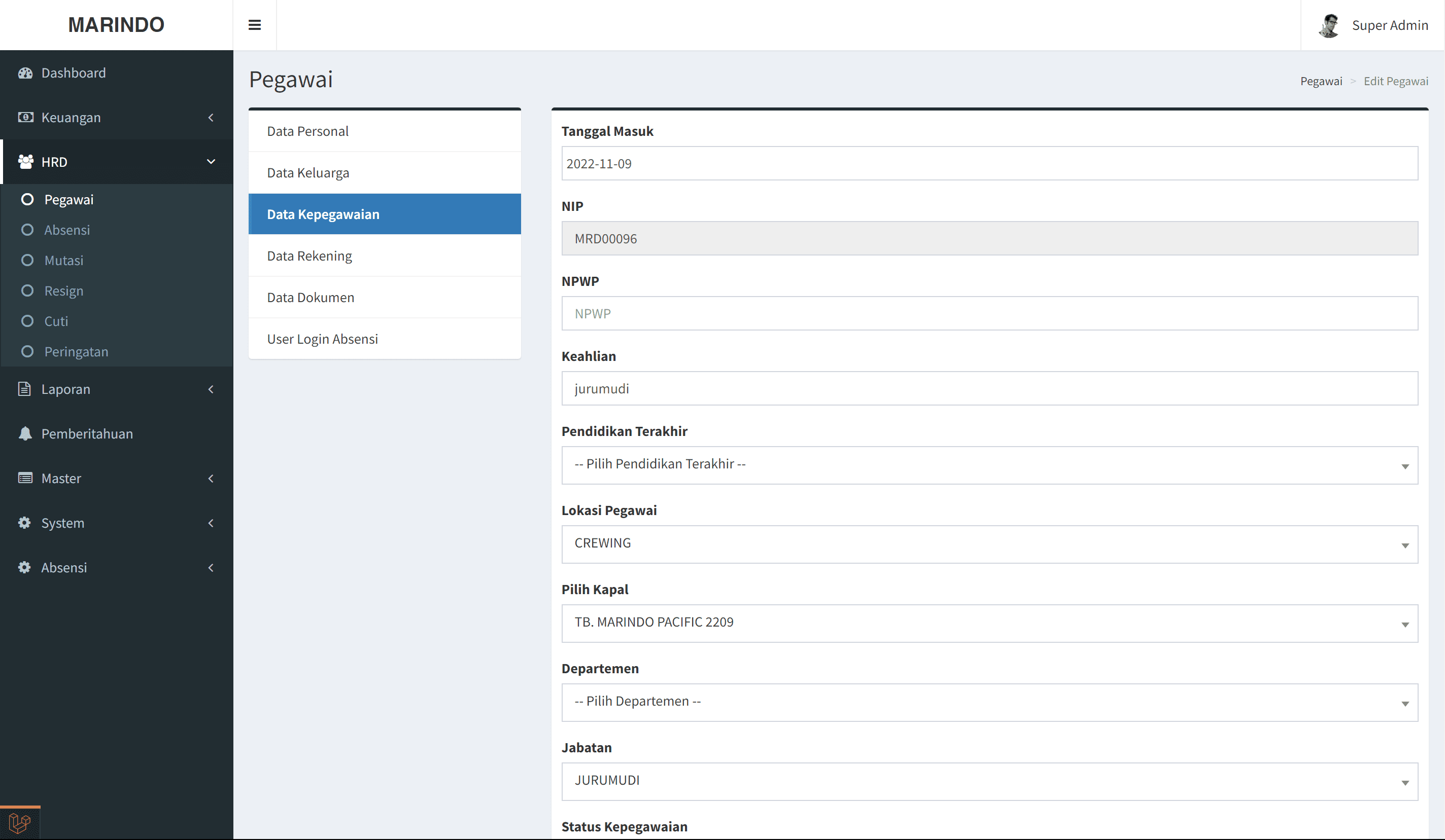 Pada form edit pegawai silahkan ubah data Tanggal Masuk (Sudah tidak dapat dirubah), NIP (Sudah tidak dapat dirubah), NPWP, Keahlian Dasar, Pendidikan Terkahir, Lokasi Kerja Pegawai, Pilih Kapal, Departemen, Jabatan, Status Kepegawaian, Status Kawin, Lokasi Pajak, Status Pegawai, Tanggal Keluar (Data ter isi apabila karyawan resign), dan memilih berbagai fasilitas untuk karyawan (BPJS, JKK, JKM, JHT, IP) dan tekan tombol Simpan