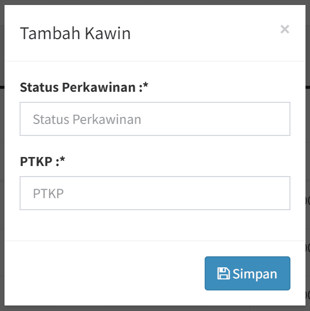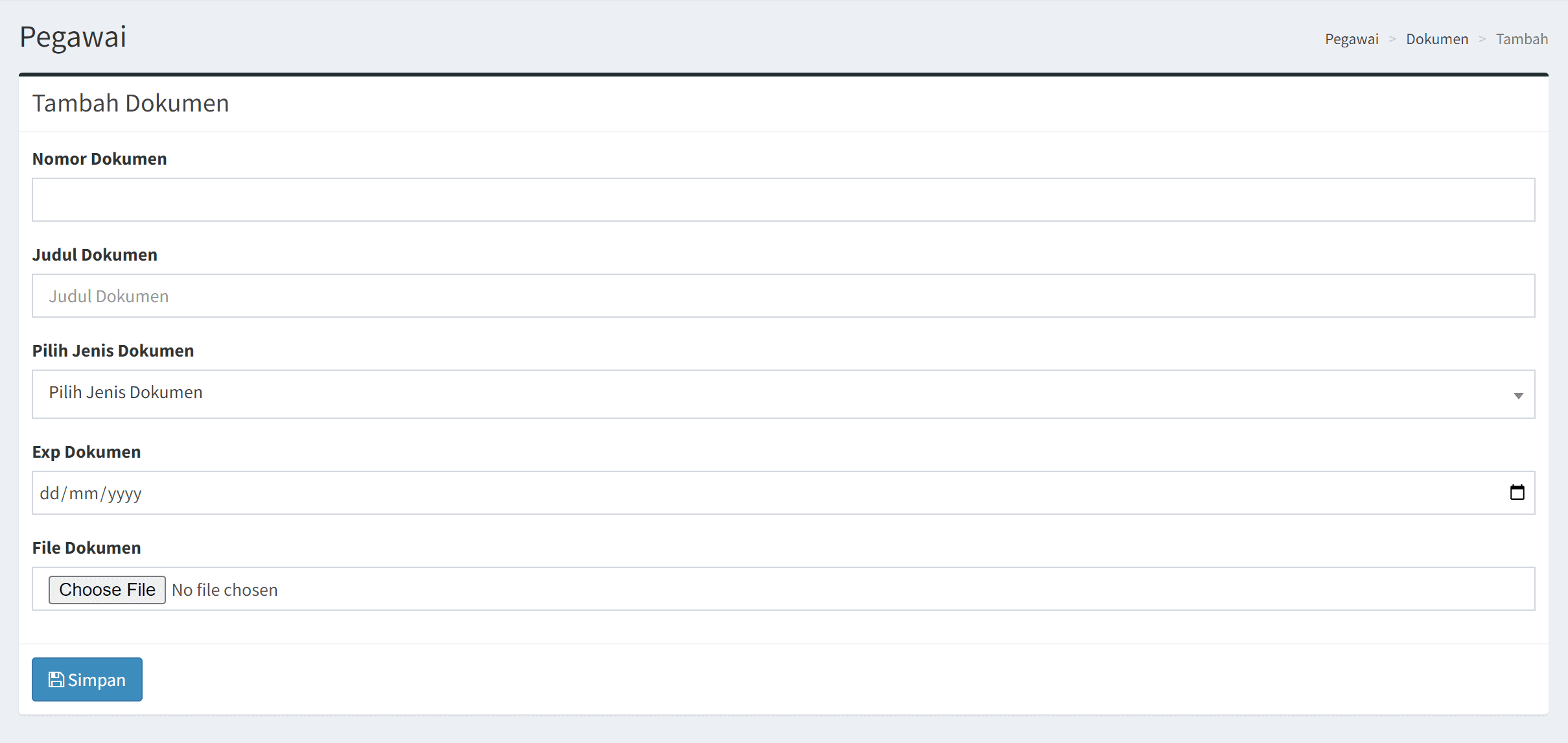 Pada form tambah pegawai silahkan memasukkan data NIK, Nama Lengkap, Tempat Lahir, Tanggal Lahir, Telepon, Agama, dan Alamat dan tekan tombol Simpan