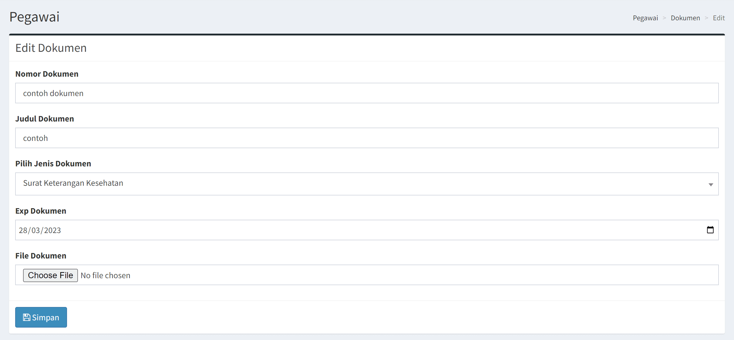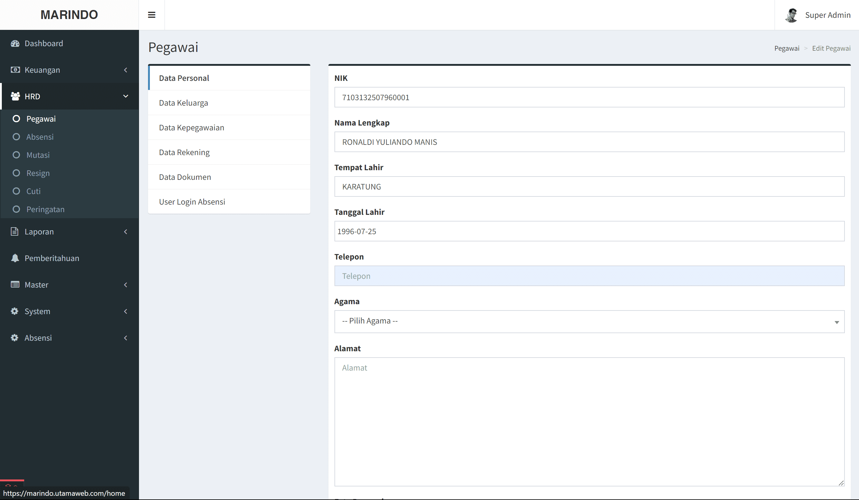 Pada form edit pegawai silahkan ubah data NIK, Nama Lengkap, Tempat Lahir, Tanggal Lahir, Telepon, Agama, dan Alamat dan tekan tombol Simpan