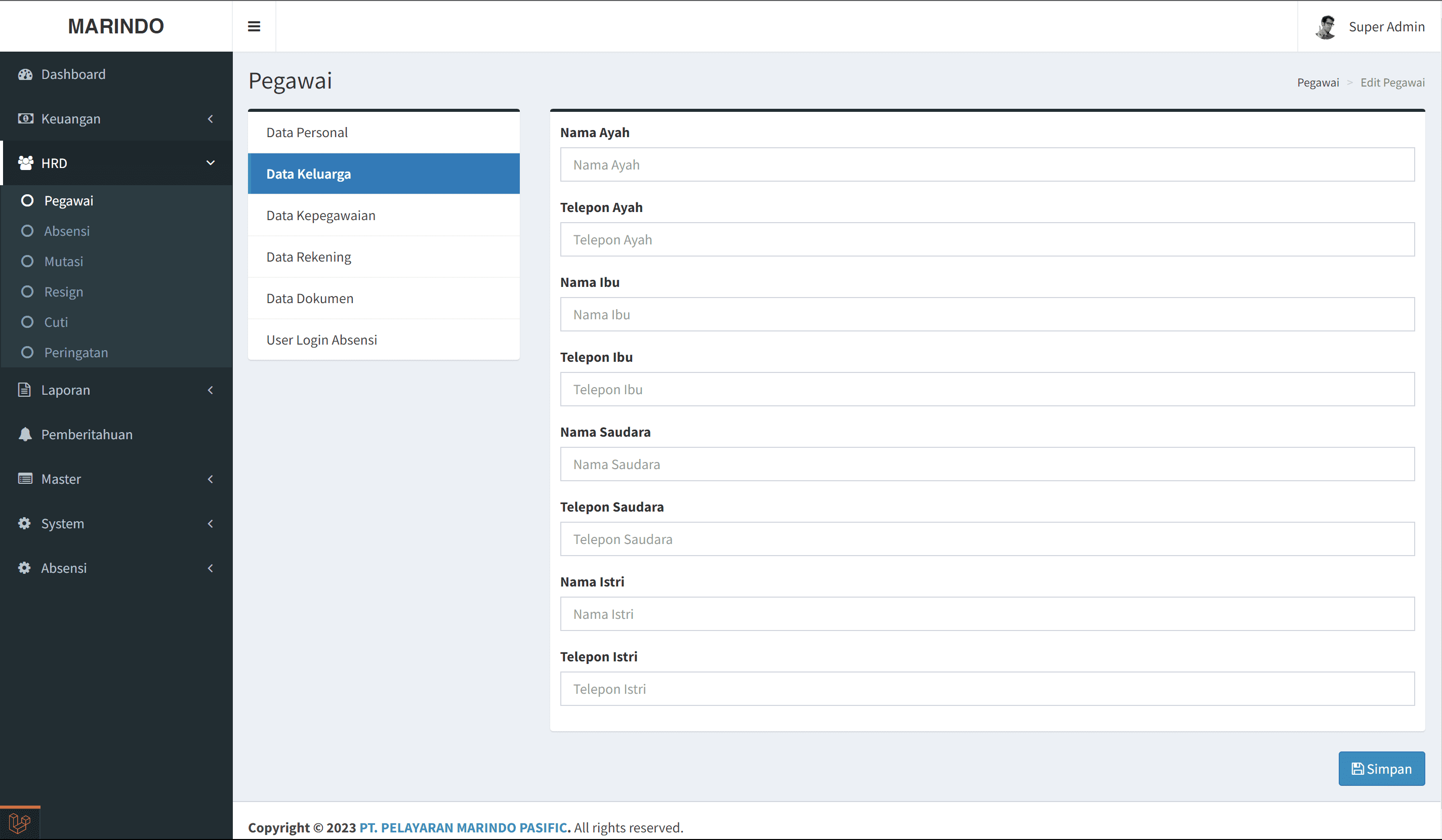 Pada form edit pegawai silahkan ubah data Nama Ayah, Telepon Ayah, Nama Ibu, Telepon Ibu, Nama Saudara, Telepon Saudara, Nama Istri, Telepon Istri dan tekan tombol Simpan