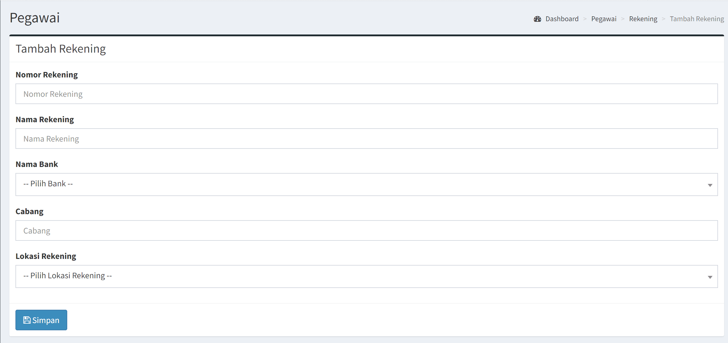Pada form tambah rekening silahkan memasukkan data Nomor Rekening, Nama Rekening, Nama Bank, Cabang, Lokasi Rekening Digunakan dan tekan tombol Simpan