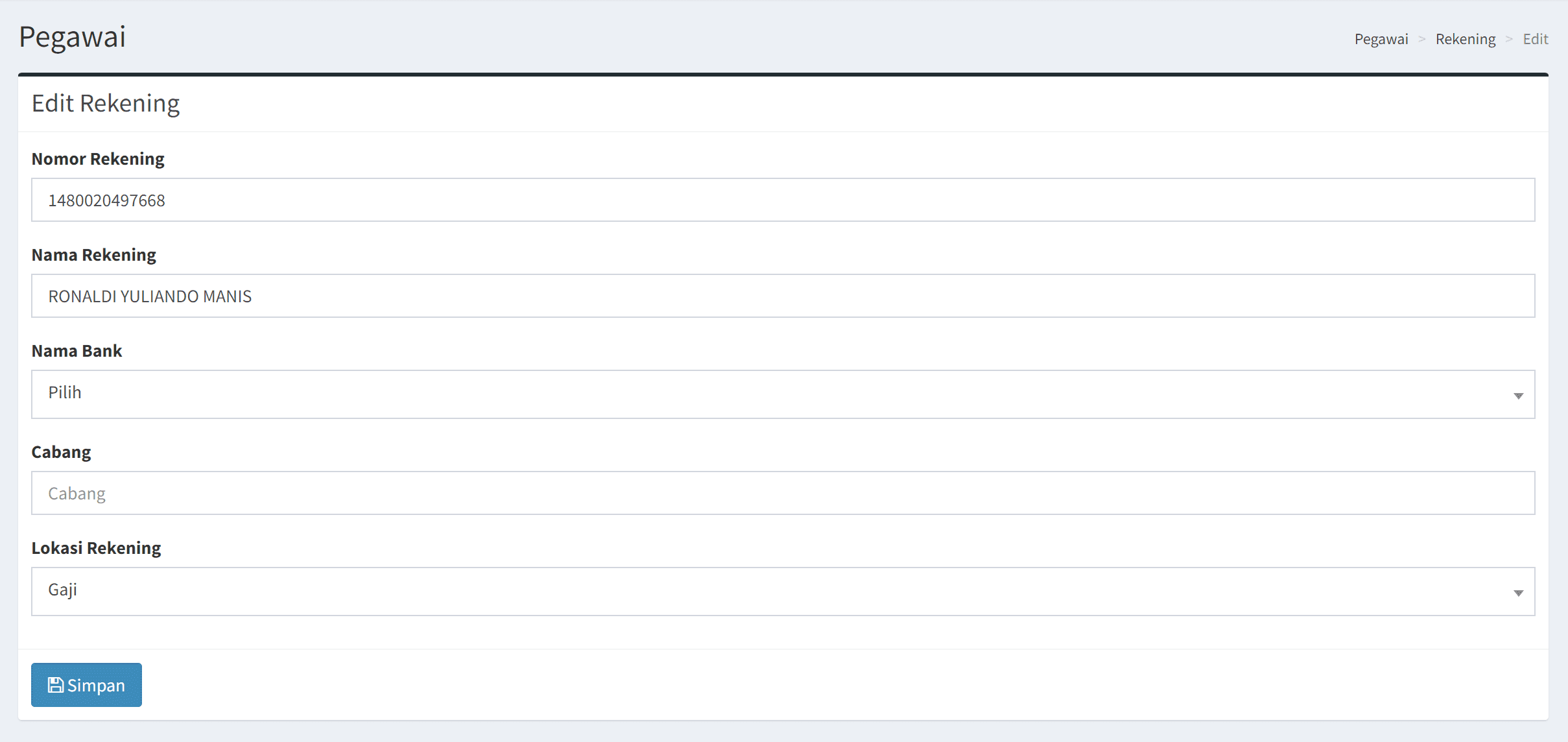 Pada form edit rekening silahkan ubah data Nomor Rekening, Nama Rekening, Nama Bank, Cabang, Lokasi Rekening Digunakan dan tekan tombol Simpan