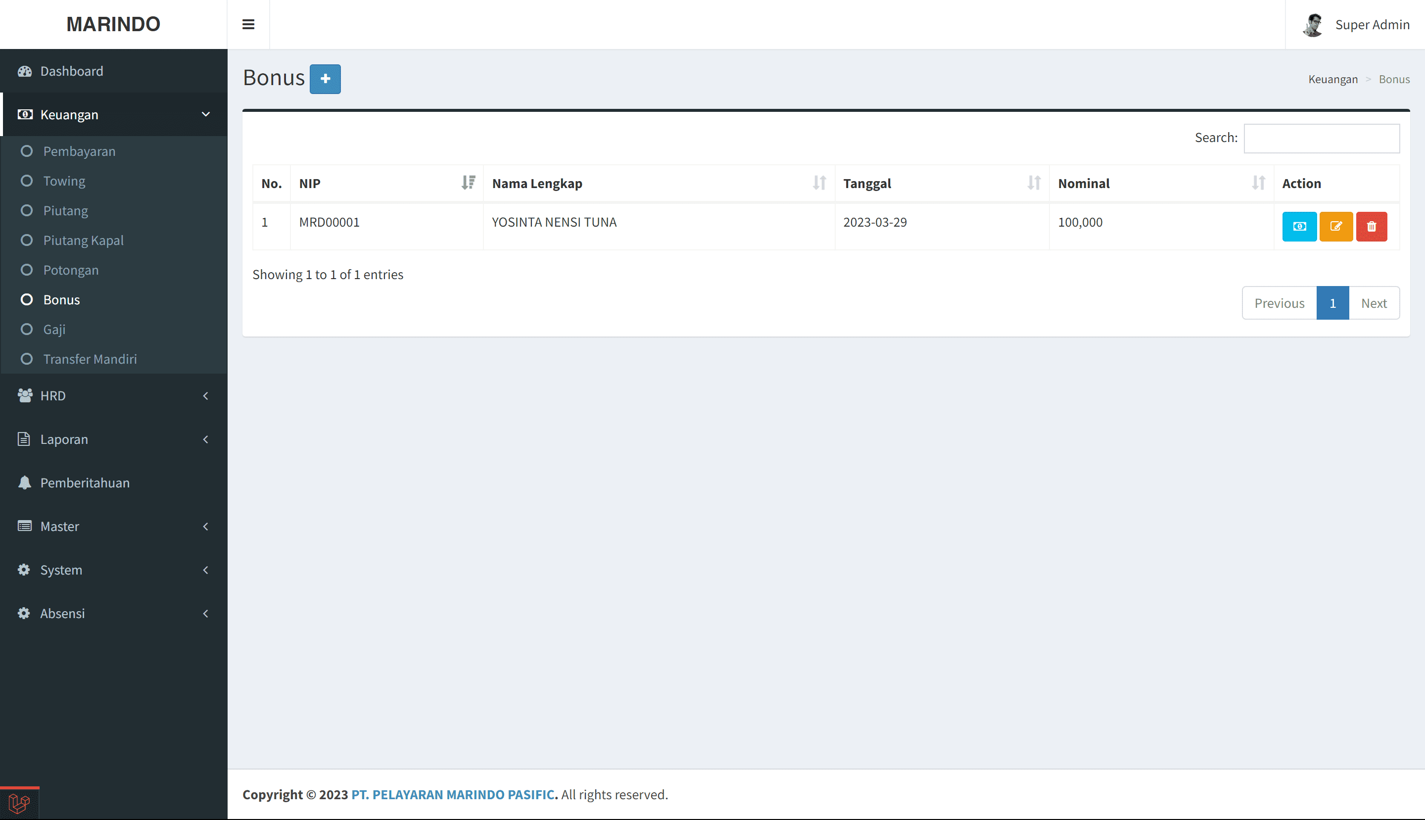 Modul bonus berisi data-data bonus-bonus yang didapat karyawan di marindo :