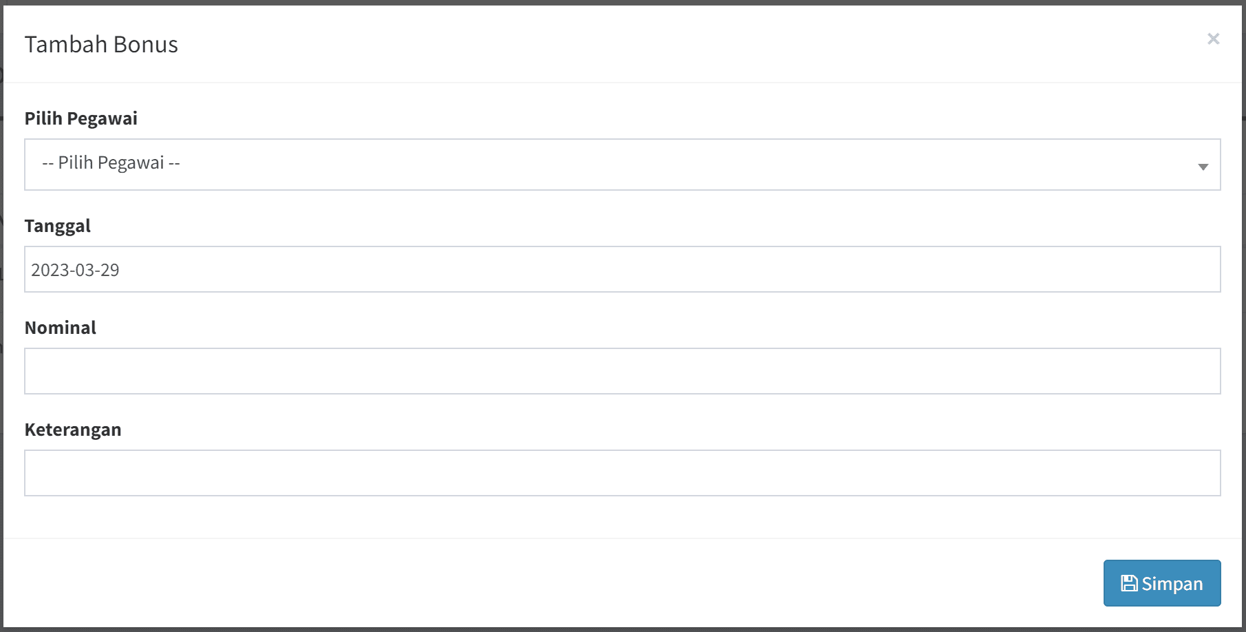 Pada form tambah bonus silahkan memasukkan data Pilih Pegawai, Tanggal, Nominal, dan Keterangan dan tekan tombol Simpan