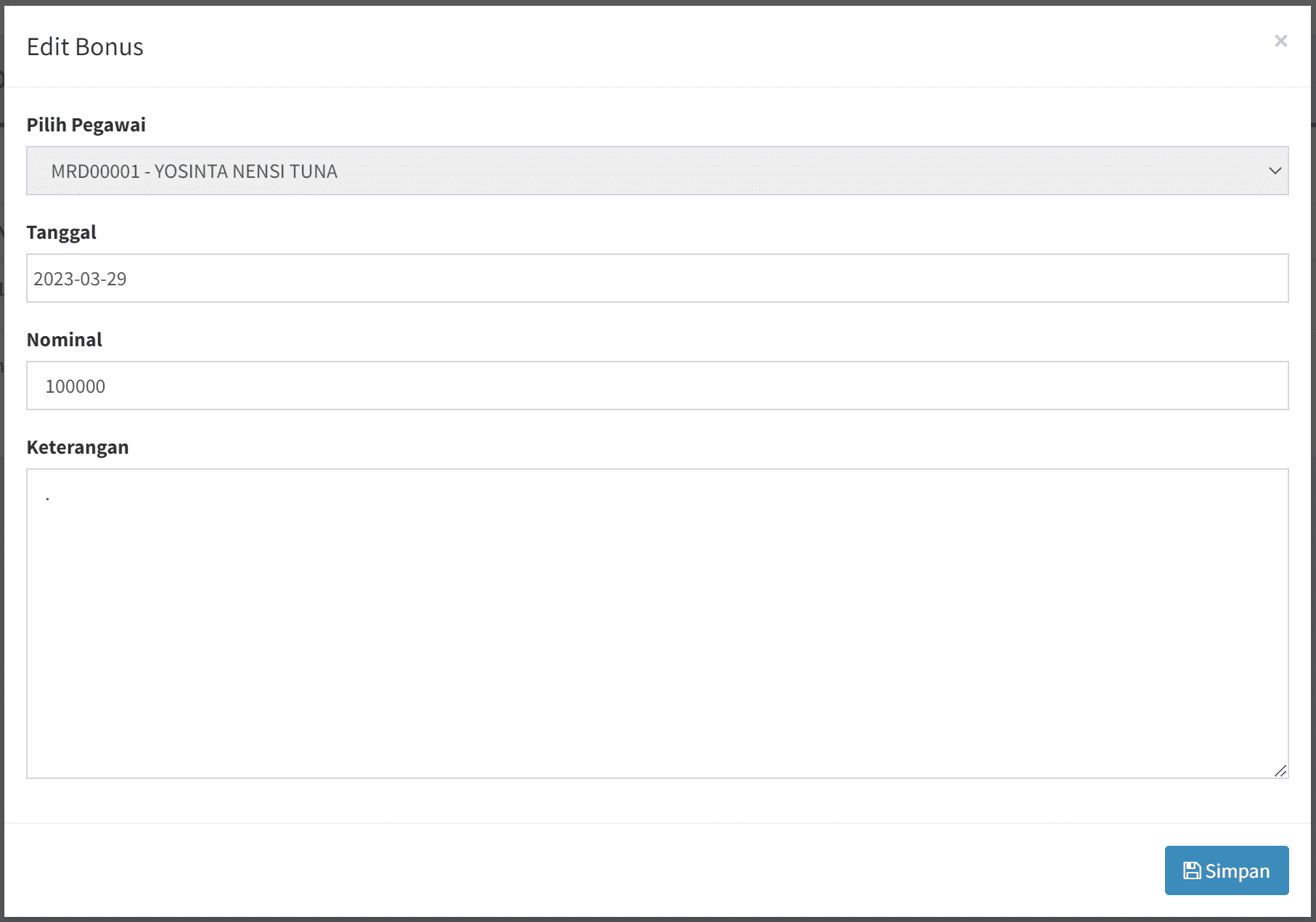 Pada form edit bonus silahkan ubah data Pilih Pegawai (Data sudah tidak dapat diubah), Tanggal, Nominal, dan Keterangan dan tekan tombol Simpan