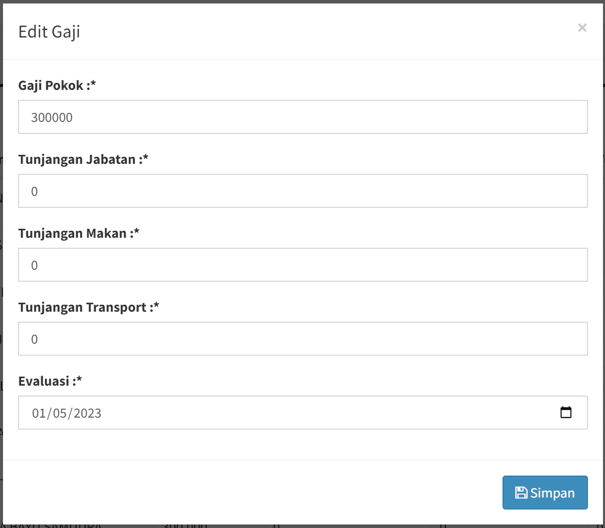 Pada form edit gaji silahkan ubah data Pilih Pegawai, Gaji Pokok, Tunjangan Jabatan, Tunjangan Makan, Tunjangan Transport, dan Masa Waktu Evaluasi dan tekan tombol Simpan