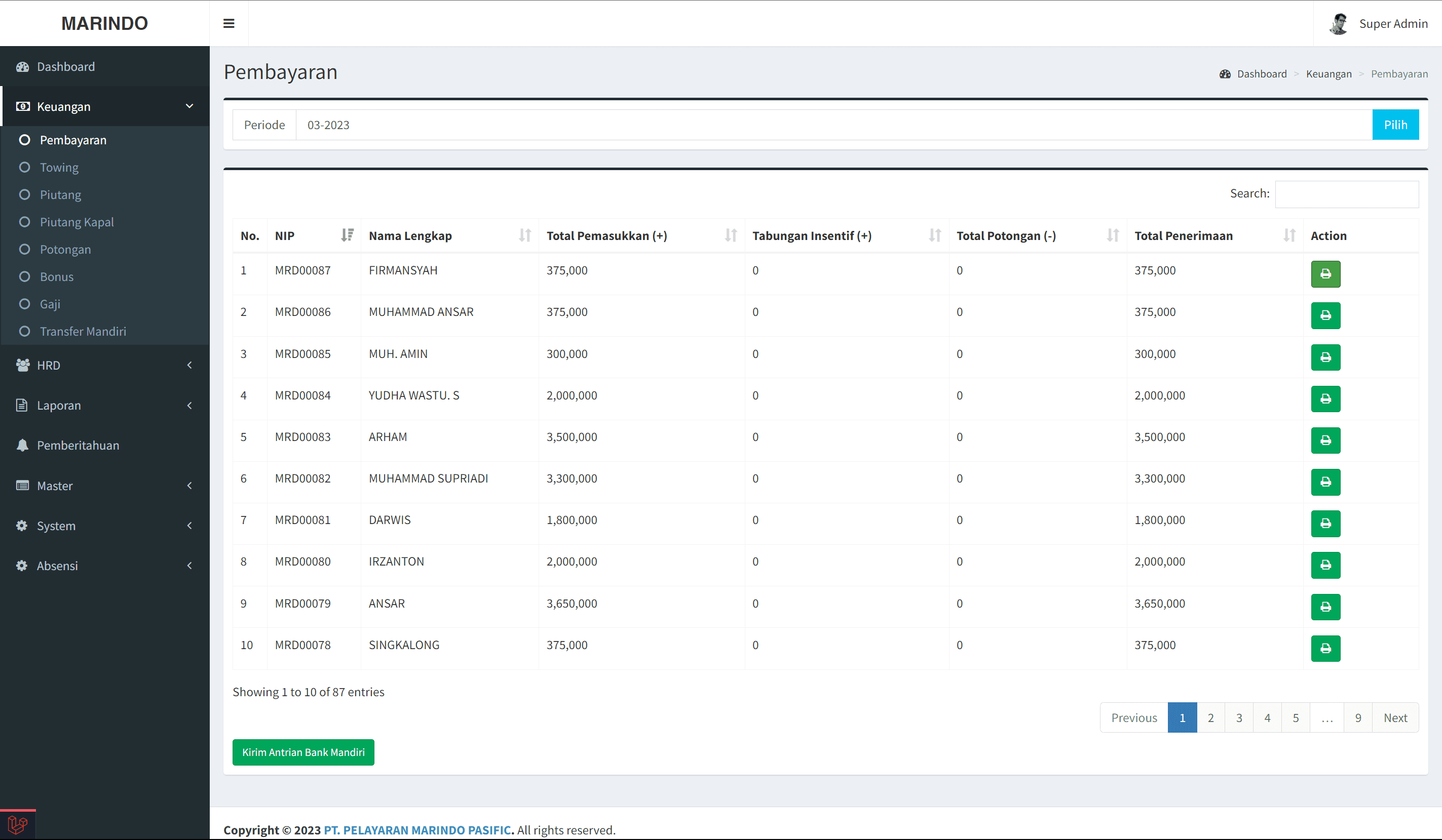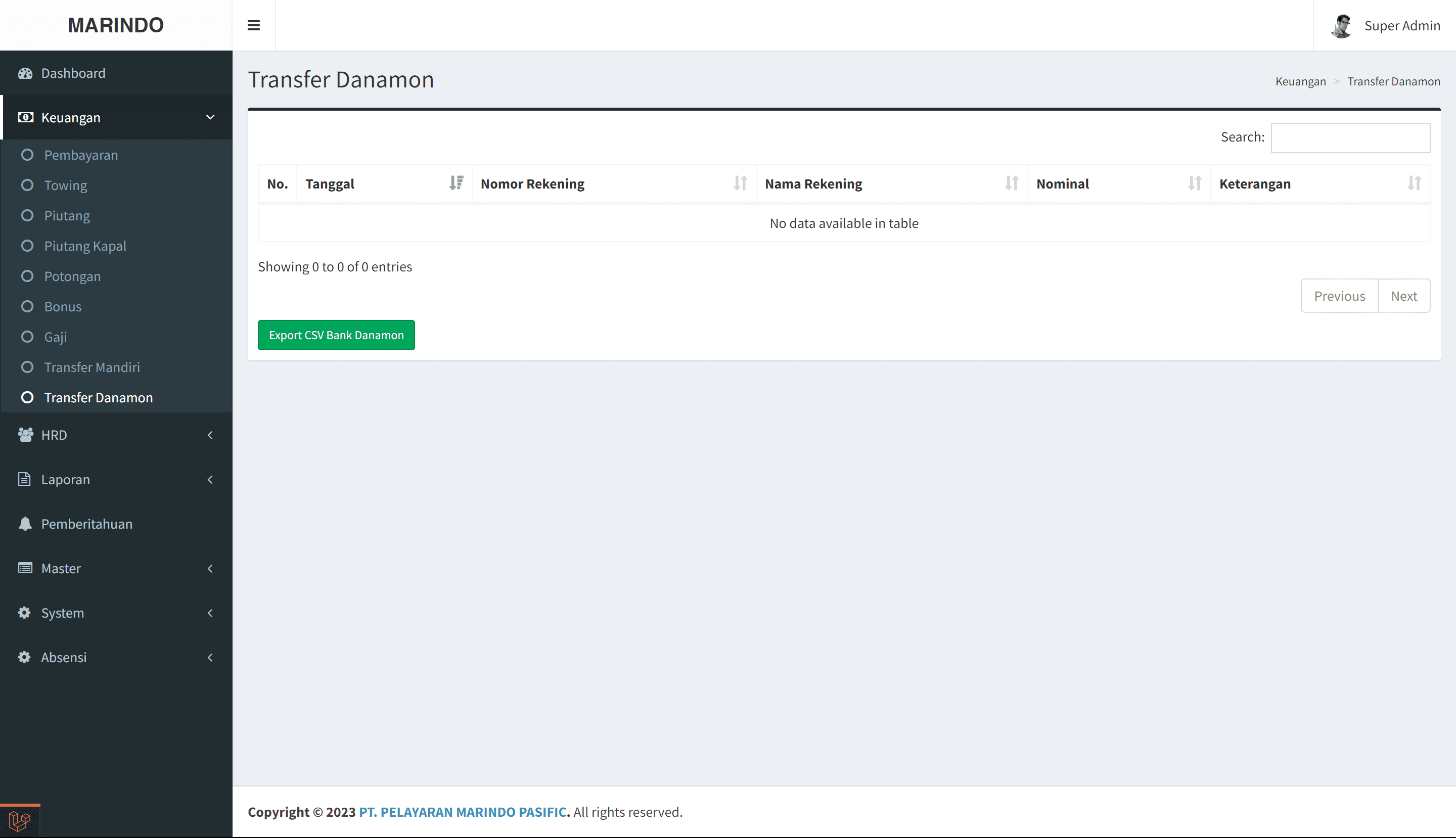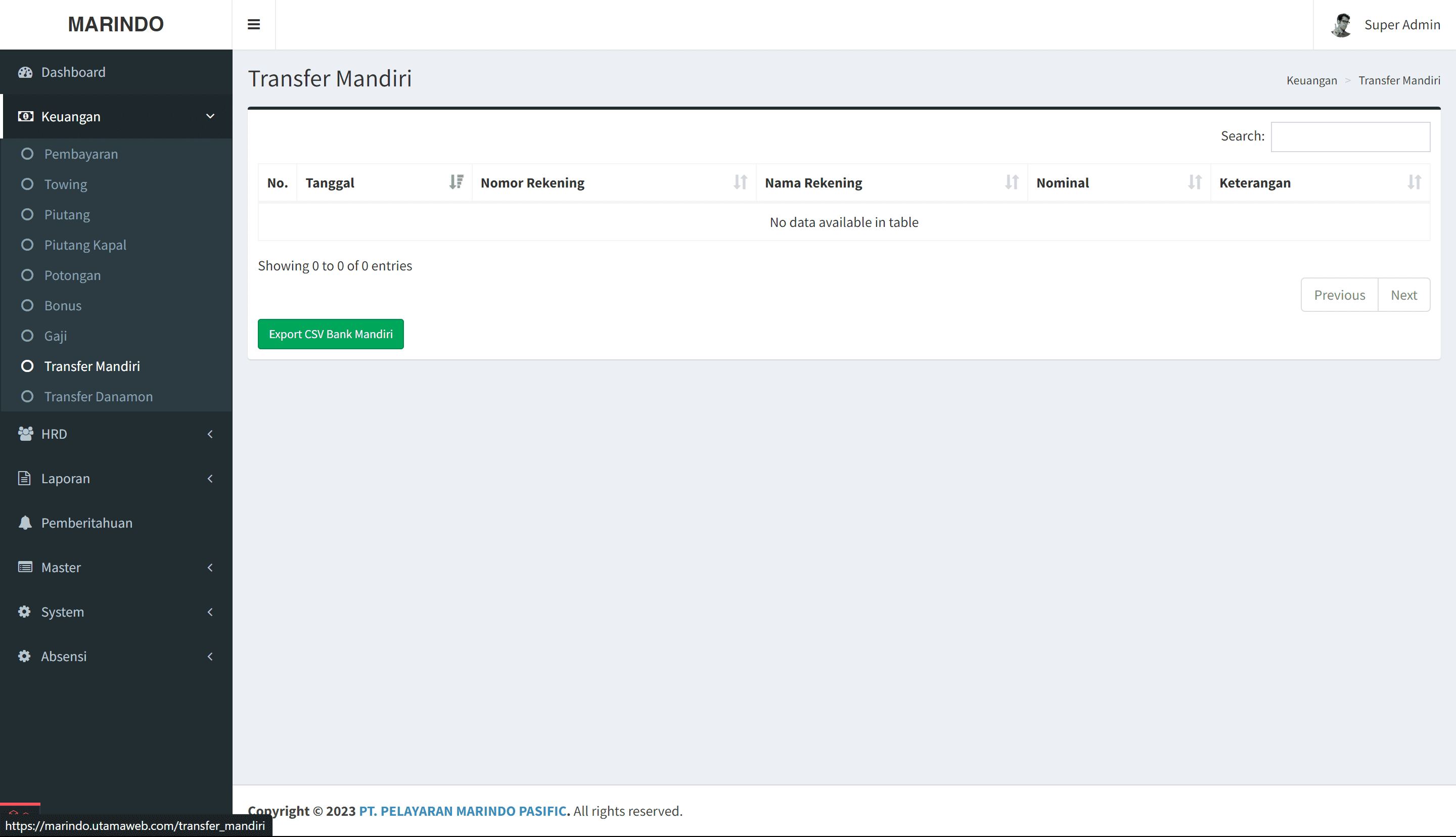 Modul transfer mandiri berisi data-data transfer Bank Mandiri karyawan yang terdapat di marindo :