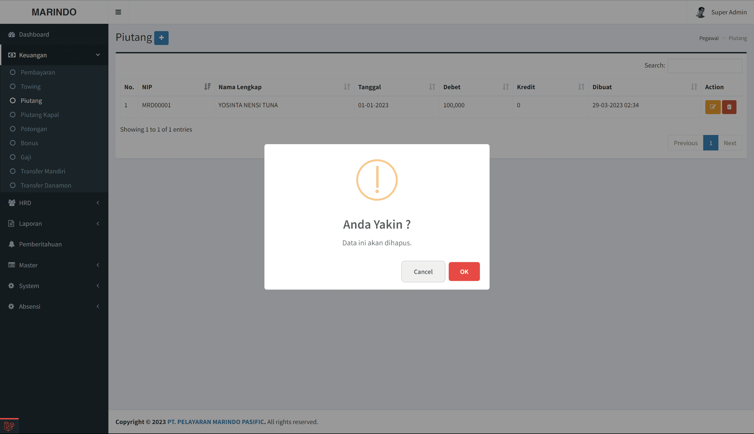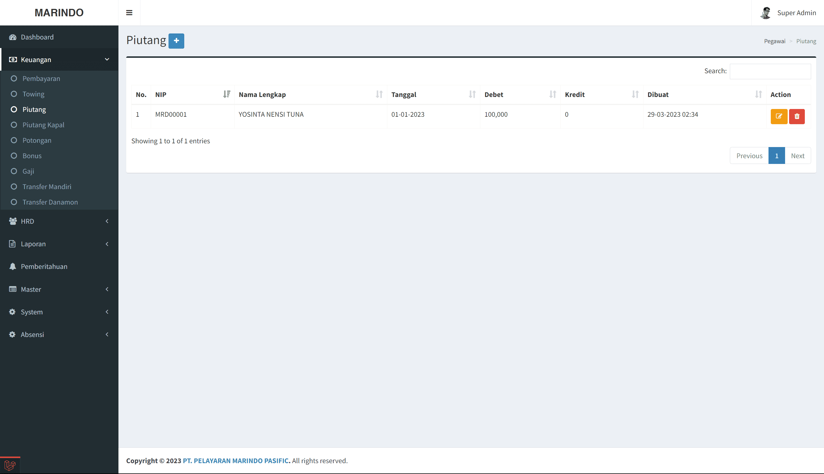 Modul piutang berisi data-data piutang karyawan yang terdapat di marindo :