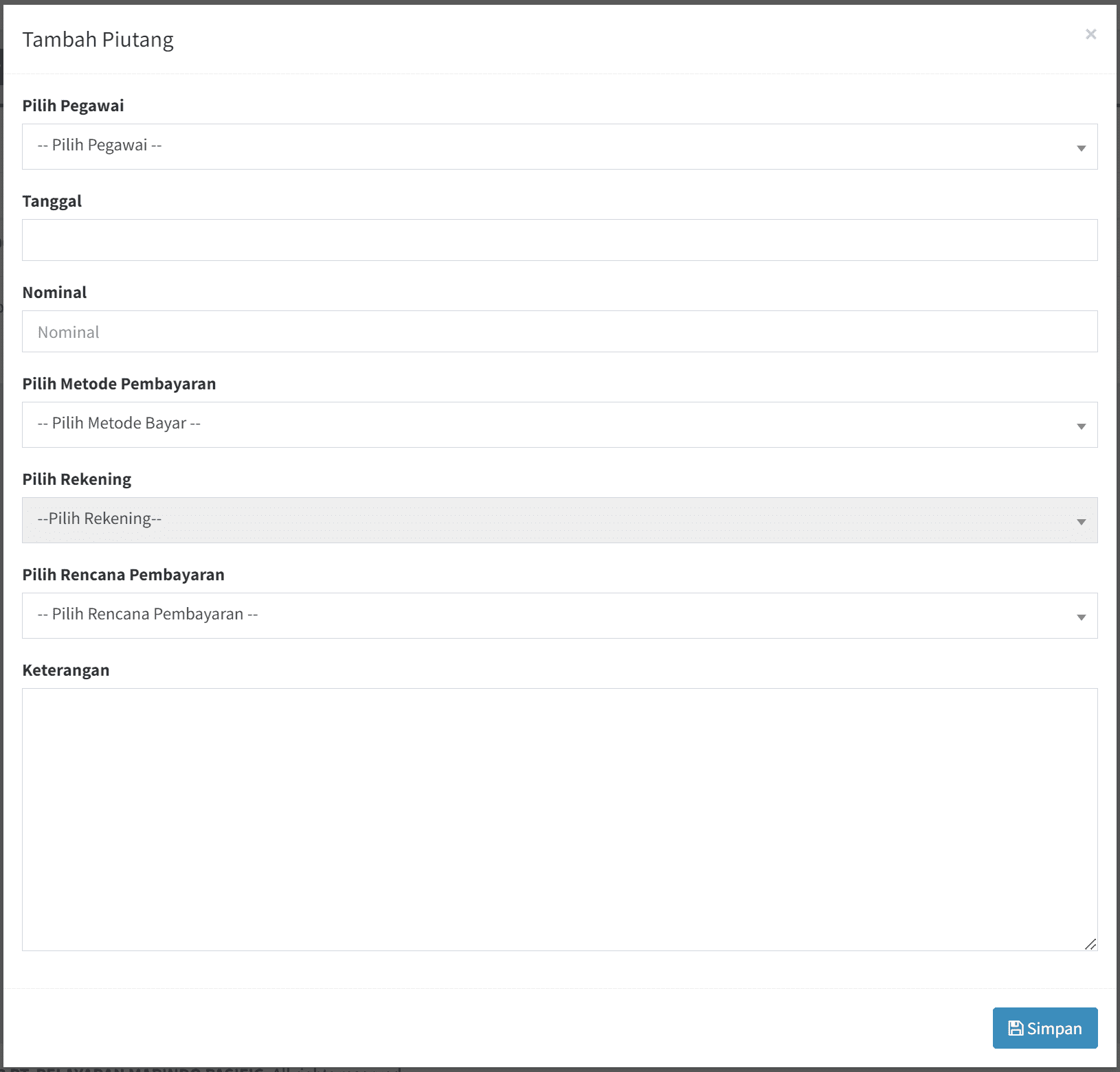 Pada form tambah piutang silahkan memasukkan data Pilih Pegawai, Tanggal, Nominal, Pilih Metode Pembayaran, Pilih Rekening, Pilih Rencana Pembayaran, dan Keterangan dan tekan tombol Simpan