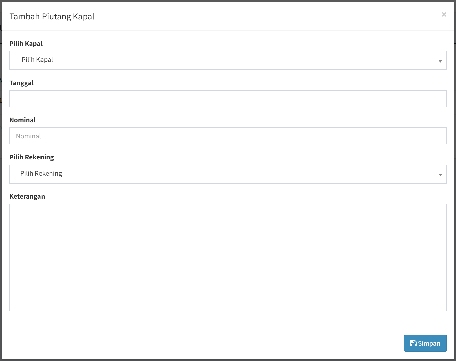 Pada form tambah piutang silahkan memasukkan data Pilih Kapal, Tanggal, Nominal, Pilih Rekening, dan Keterangan dan tekan tombol Simpan