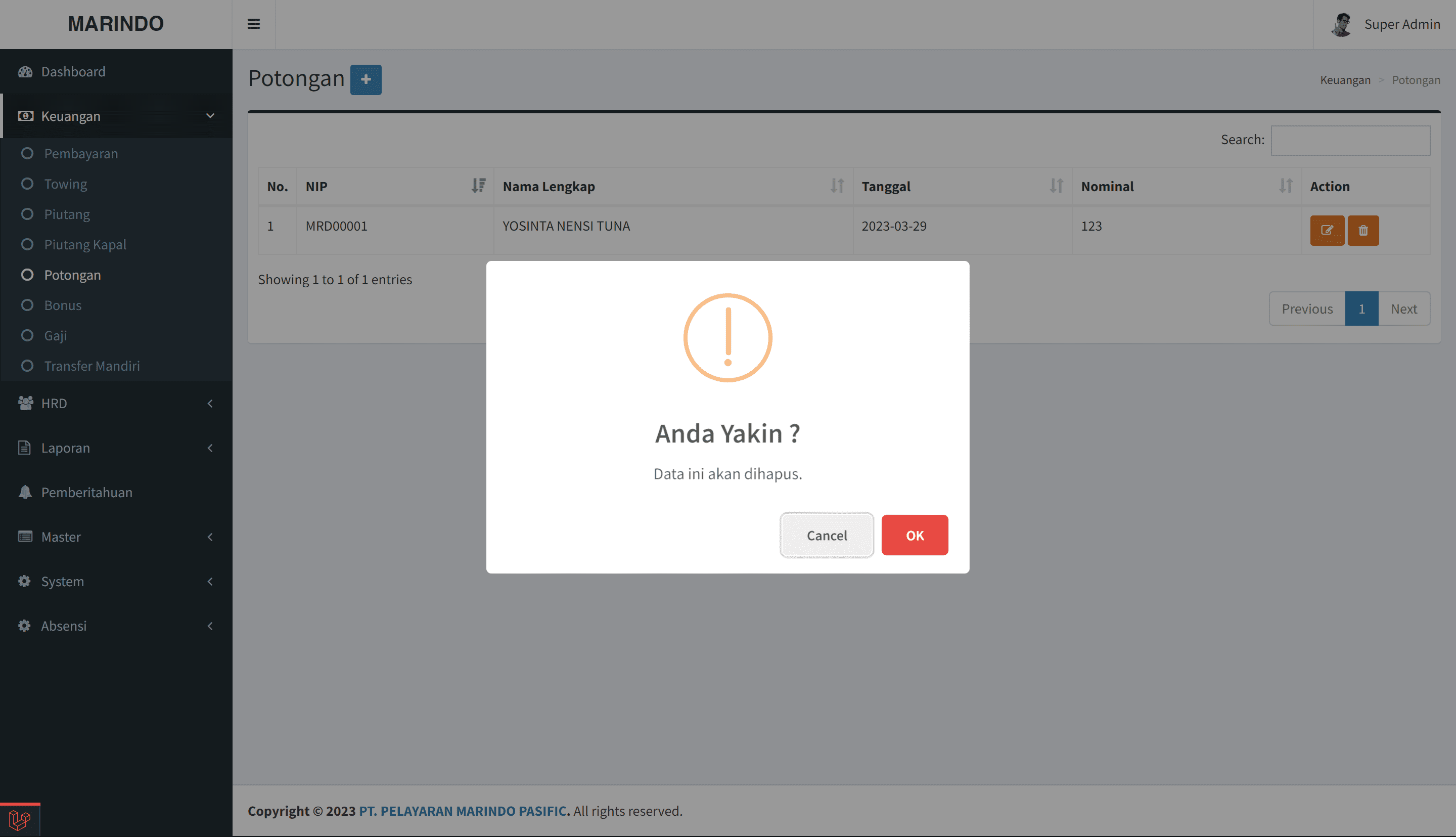 Modul potongan berisi data-data potongan-potongan yang didapat karyawan di marindo :