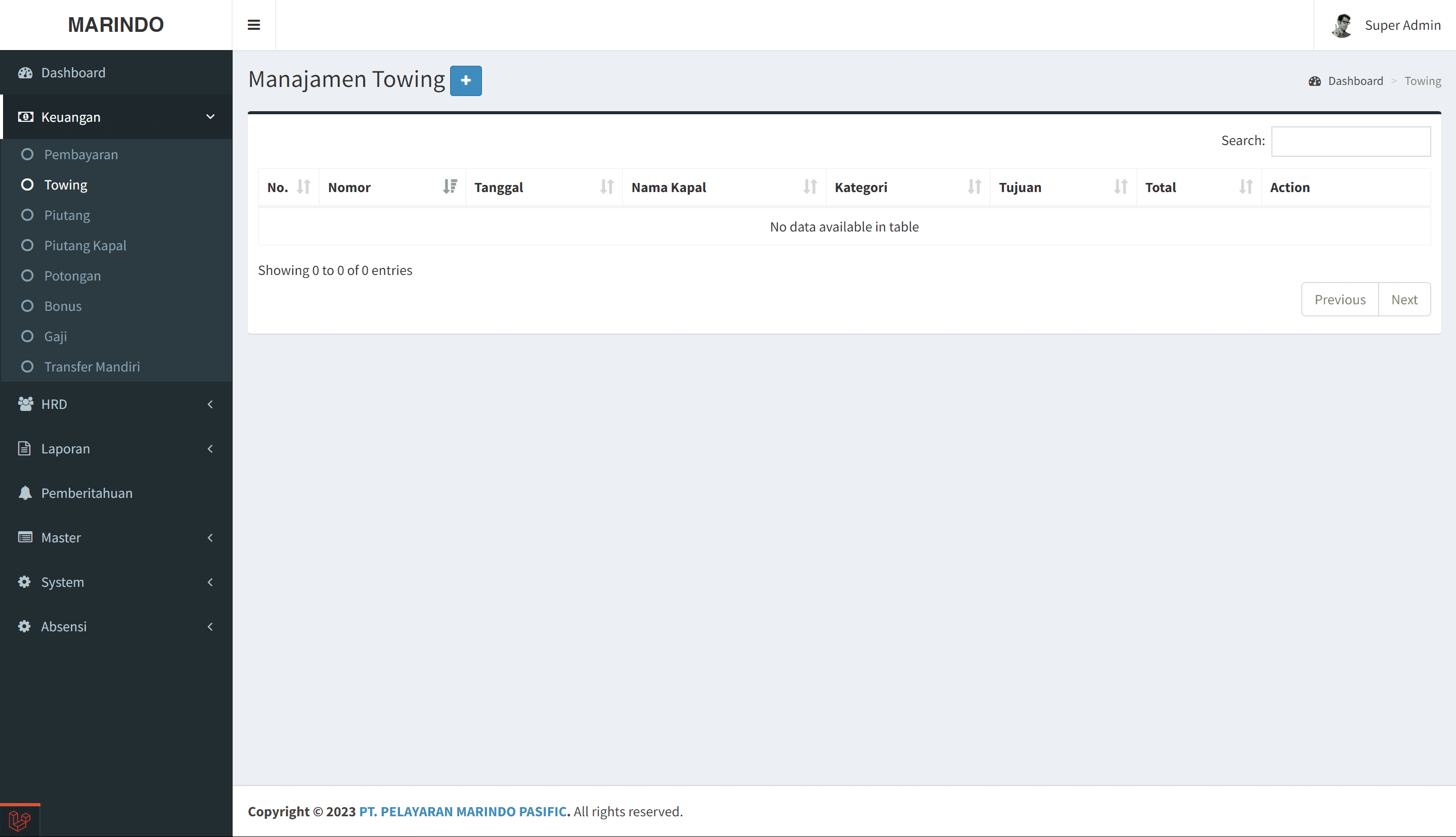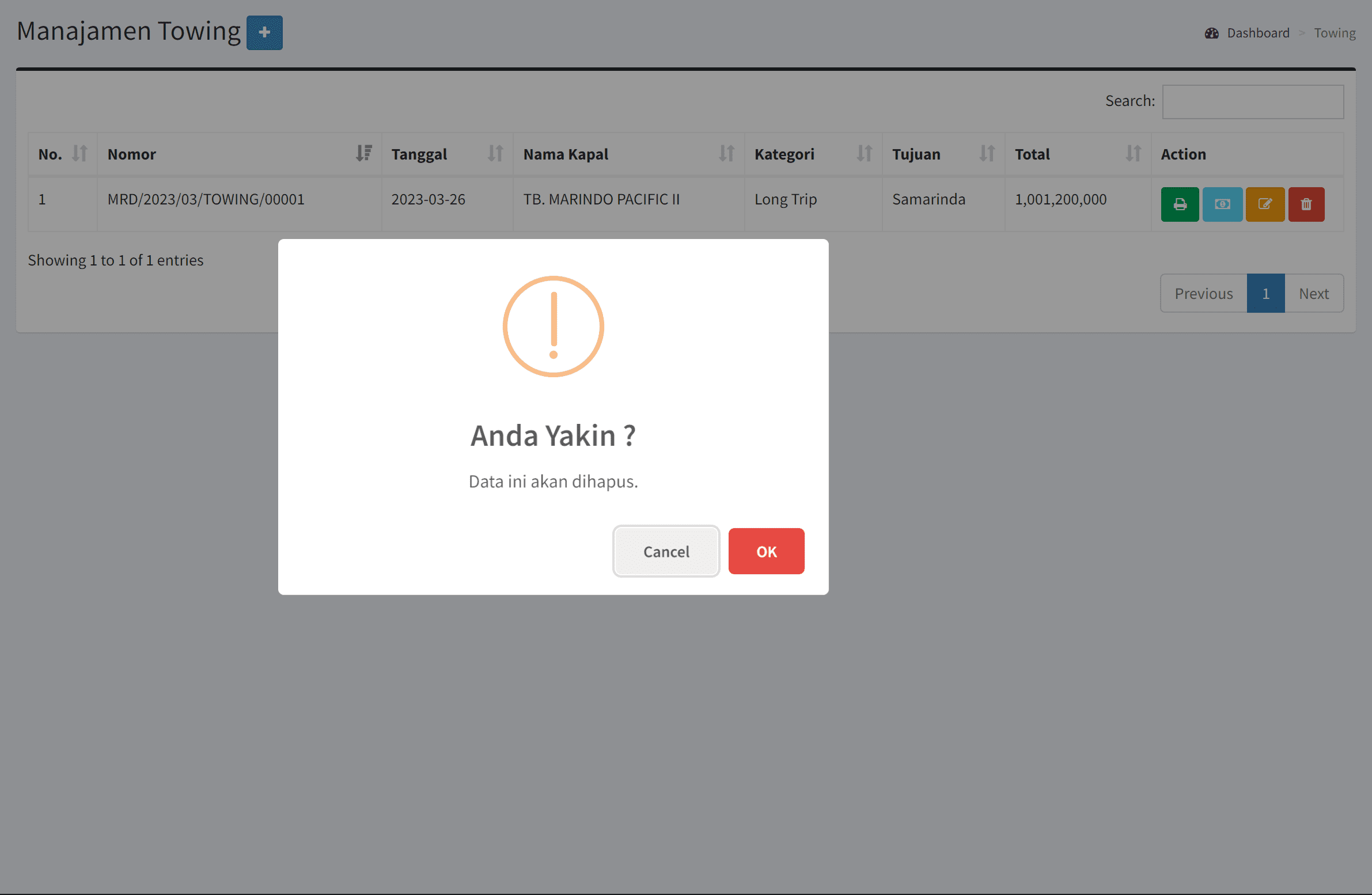 Pada halaman towing menampilkan data No, Nomor, Tanggal, Nama Kapal, Kategori, Tujuan, dan Total