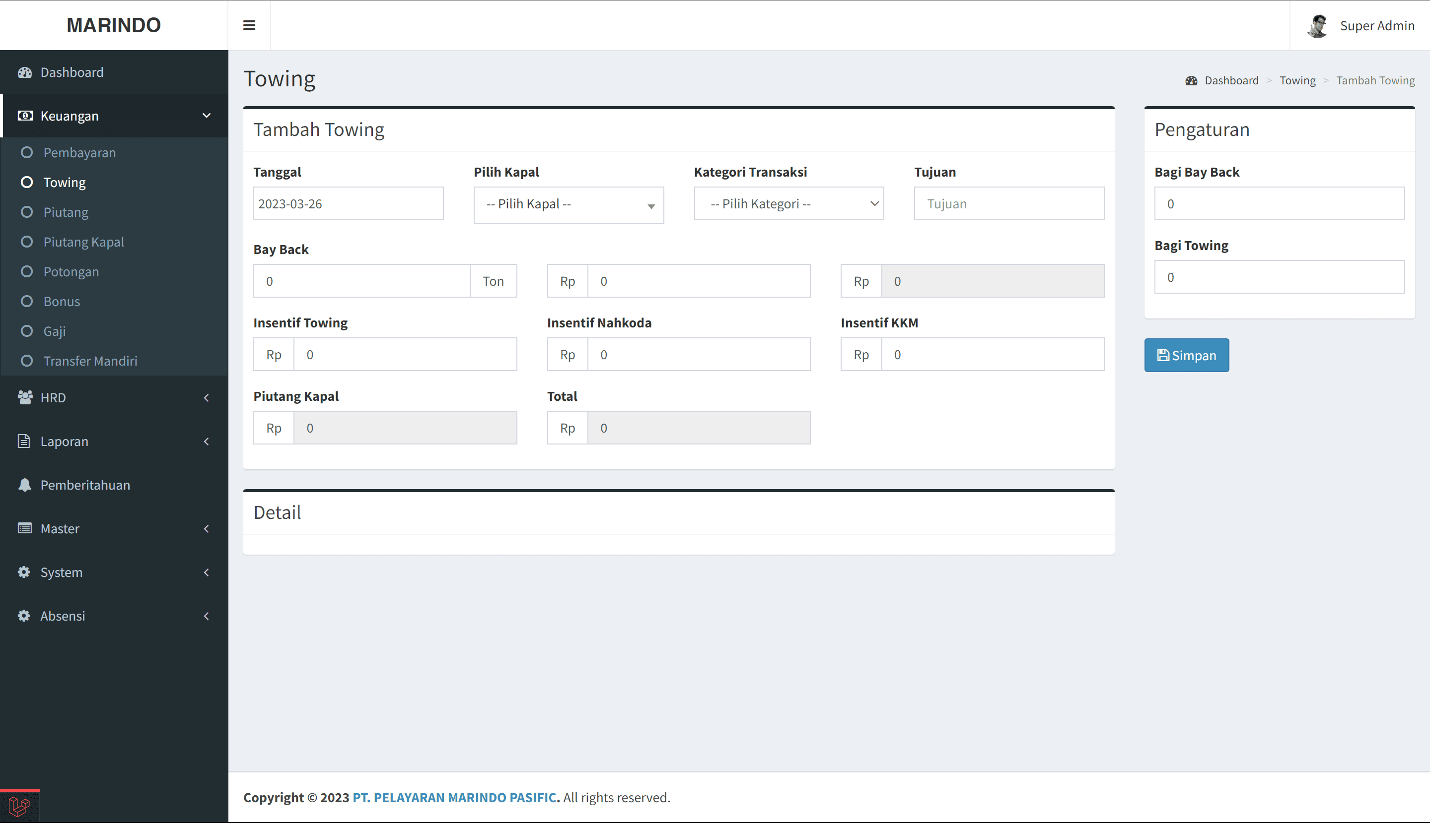 Pada form tambah towing silahkan memasukkan data Tanggal, Pilih Kapal, Kategori Transaksi, Tujuan, Bay Back, Insentif Towing, Instenif Nahkoda, Insentif KKM, Piutang Kapal, Bagi Bay Back, dan Bagi Towing dan tekan tombol Simpan