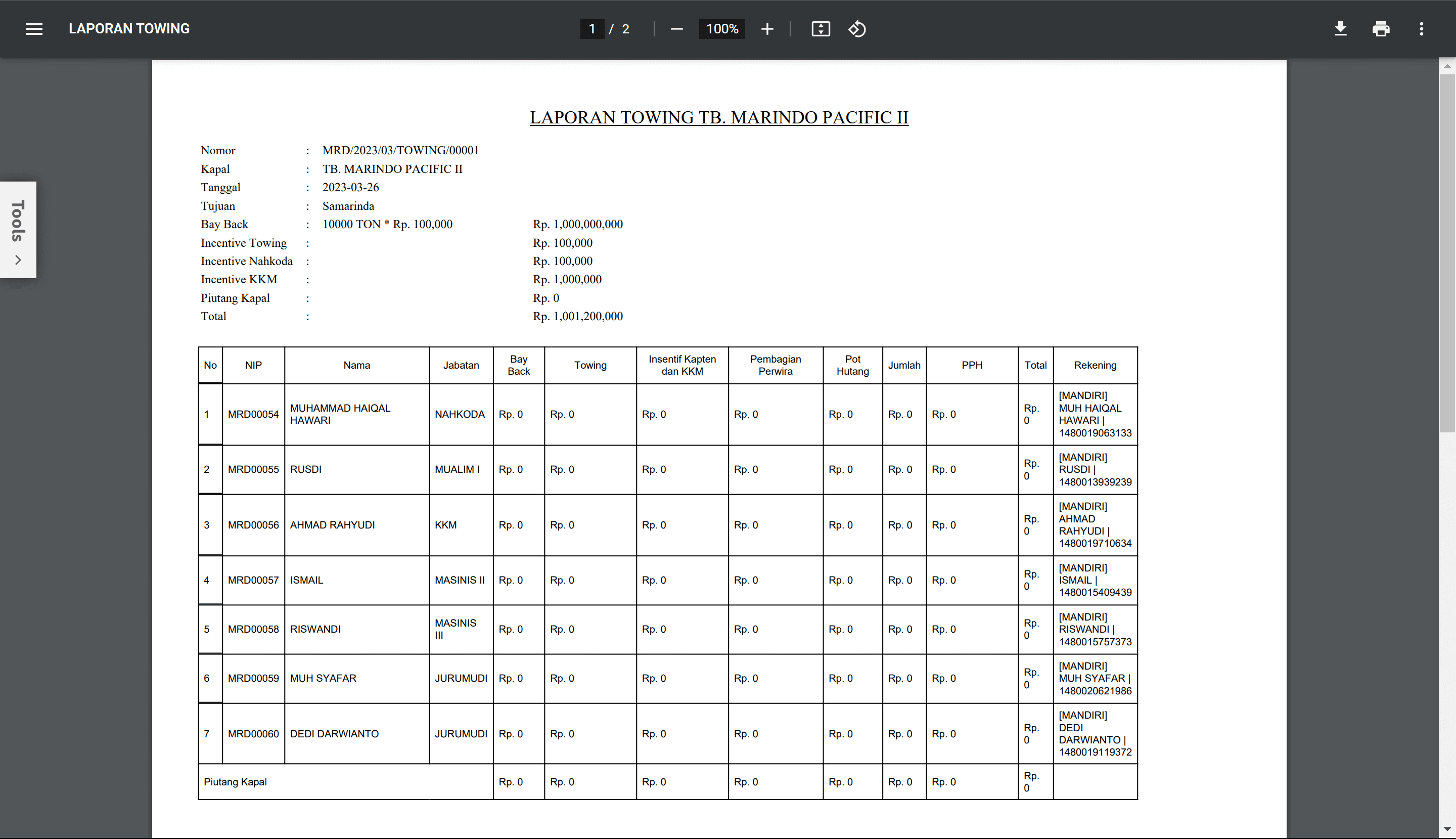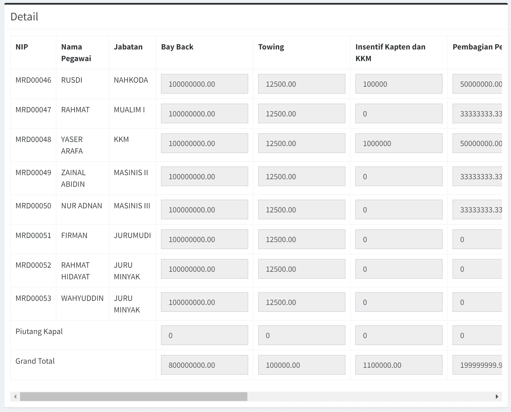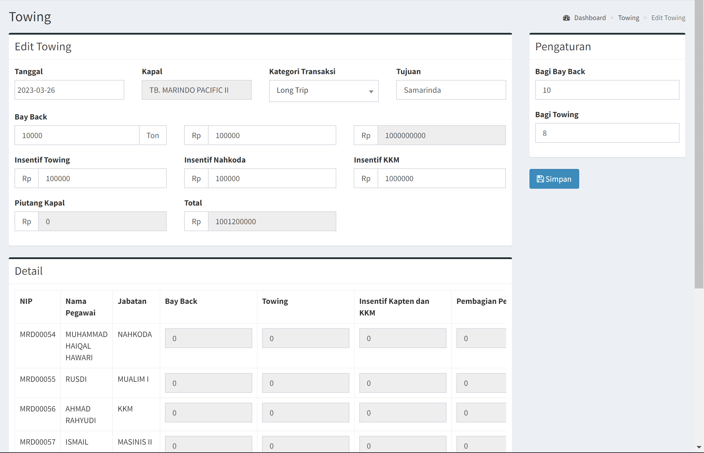 Pada form detail towing menampilkan data NIP, Nama Pegawai, Jabatan, Bay Back, Towing, Insentif Kapten dan KKM, Pembagian Perwira, Potongan Hutang, Jumlah, Potongan Insentif, Total, dan Rekening dan tekan tombol Simpan