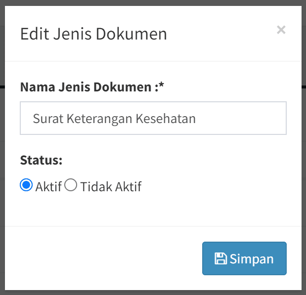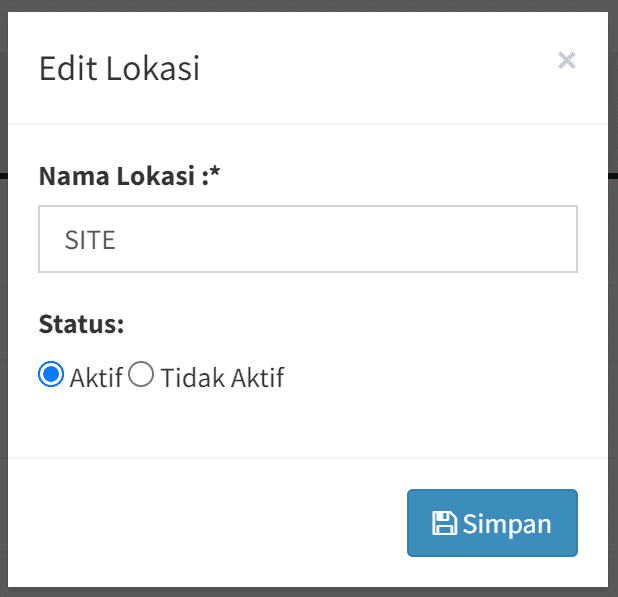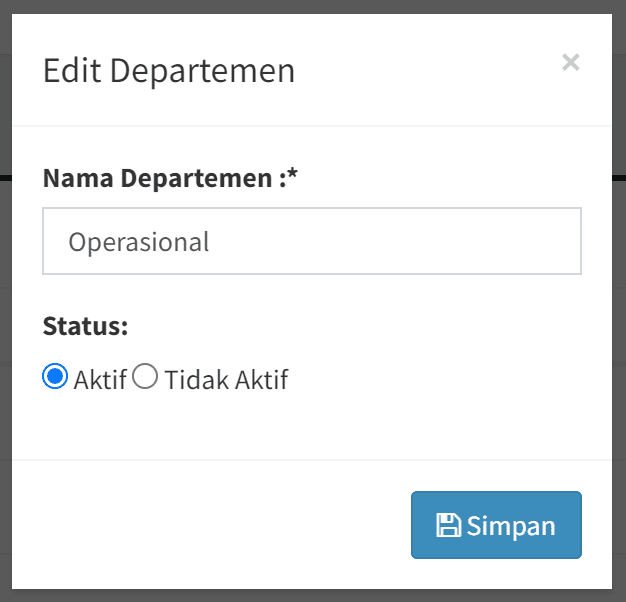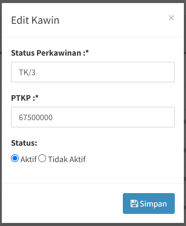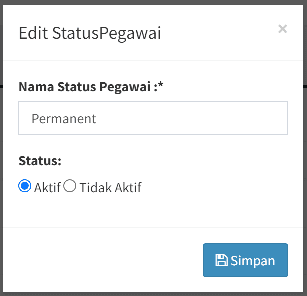 Pada form edit status pegawai silahkan ubah data Nama Status Pegawai, Status (optional), dan tekan tombol Simpan