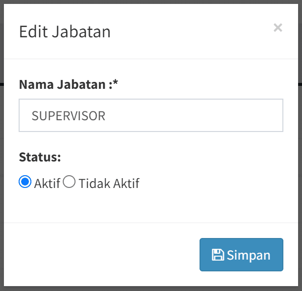 Pada form edit jabatan silahkan ubah data Nama Jabatan, Status (optional), dan tekan tombol Simpan