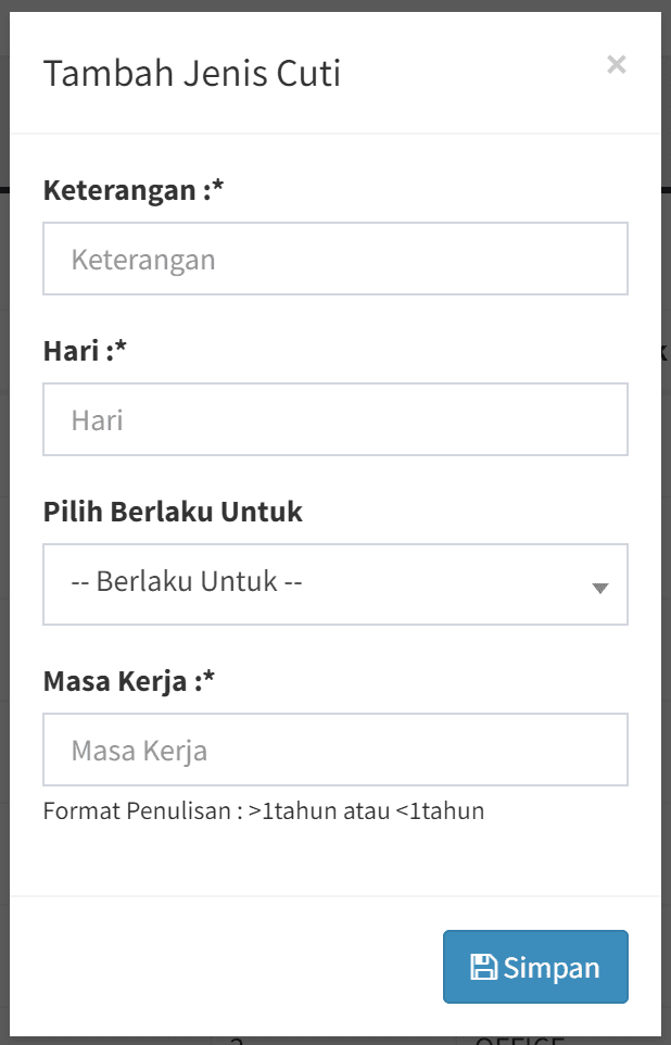 Pada form tambah jenis Cuti silahkan memasukkan data Keterangan, Hari, Pilih Berlaku Untuk, Masa Kerja dan tekan tombol Simpan