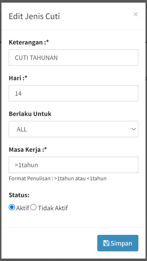 Pada form edit jenis Cuti silahkan ubah data Keterangan, Hari, Pilih Berlaku Untuk, Masa Kerja, Status (optional), dan tekan tombol Simpan