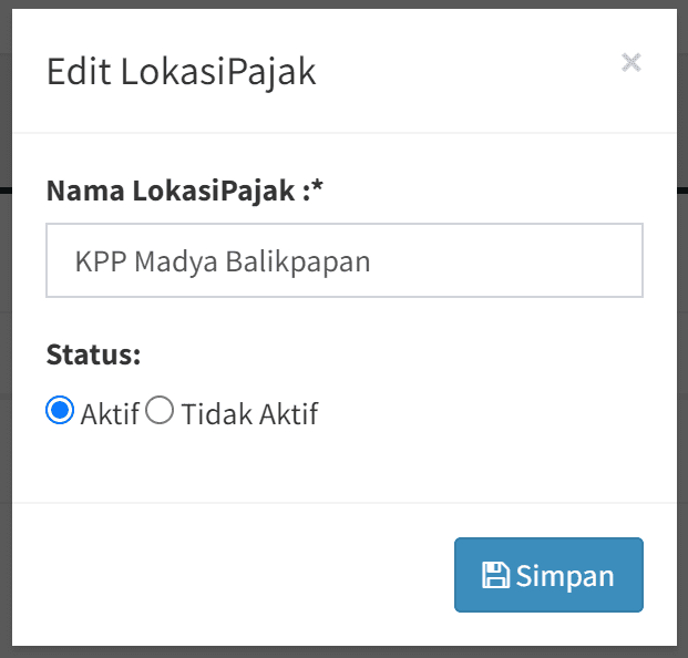 Pada form edit lokasi pajak silahkan ubah data Pilih Jabatan, Nominal Minimum, Nominal Maksimum, Keterangan, Status (optional), dan tekan tombol Simpan