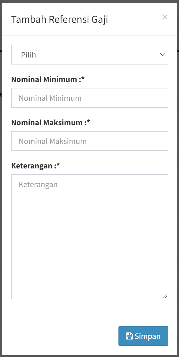 Pada form tambah lokasi pajak silahkan memasukkan data Pilih Jabatan, Nominal Minimum, Nominal Maksimum, Keterangan dan tekan tombol Simpan