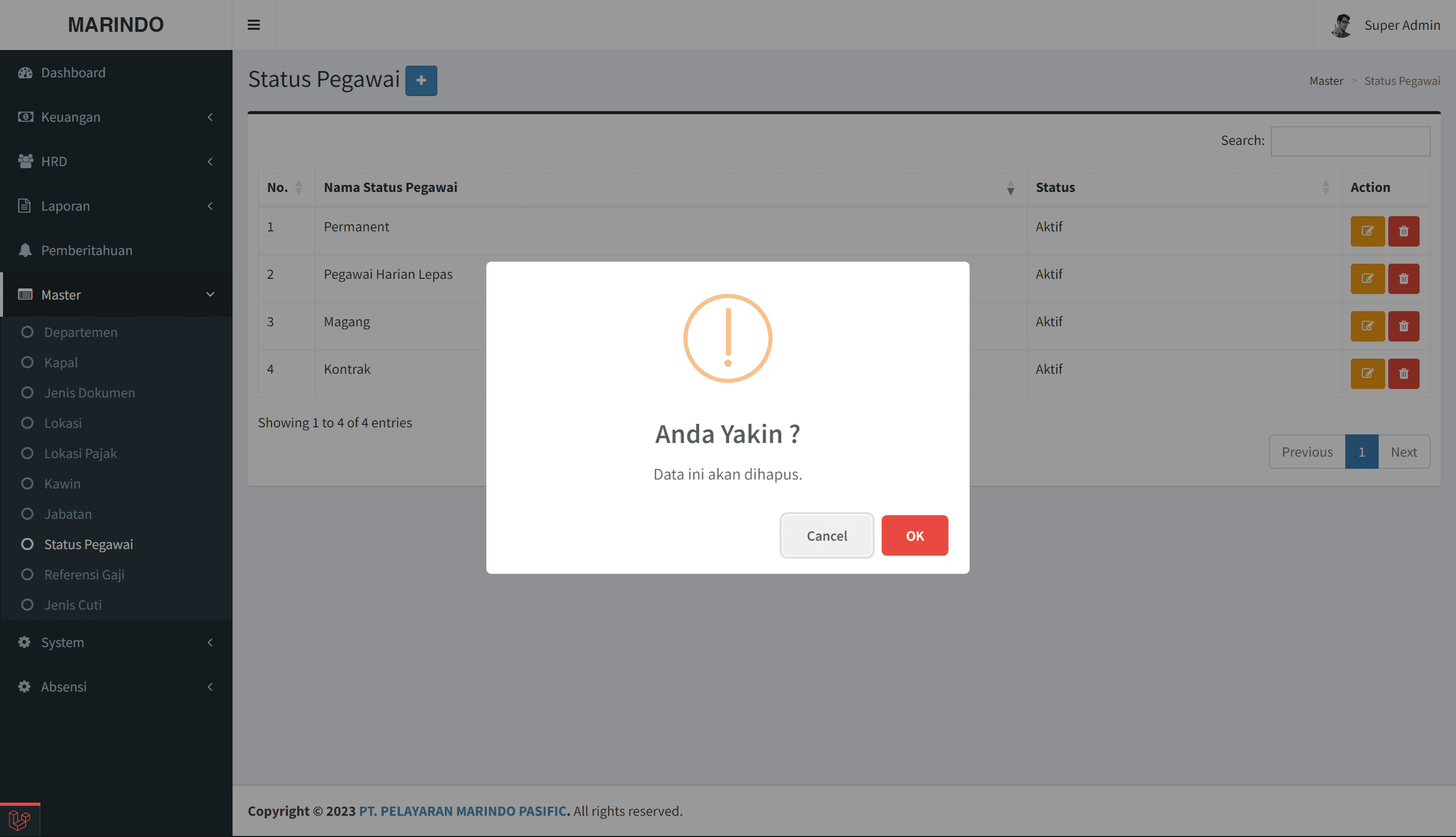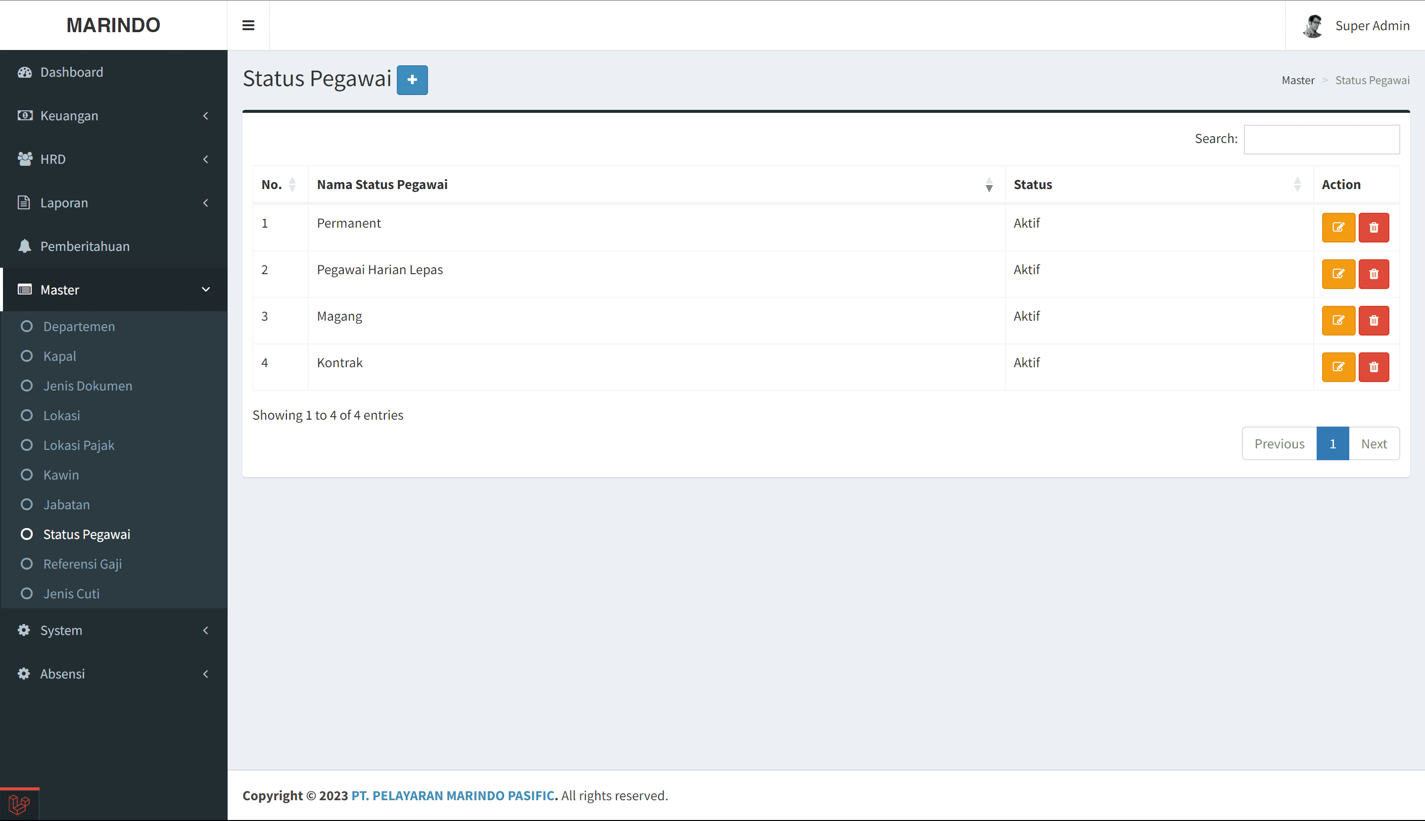 Modul status pegawai berisi data-data status pegawai yang terdapat di marindo :
