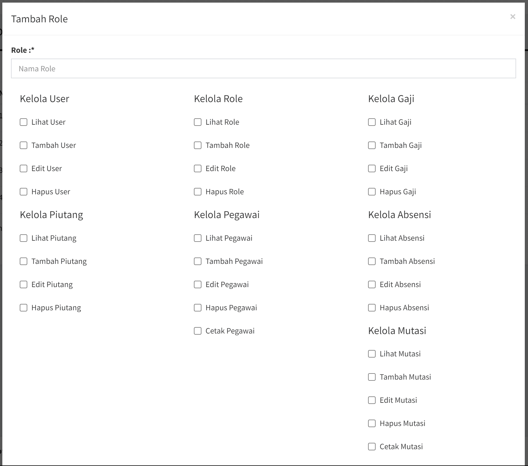 Pada form tambah role silahkan memasukkan data Nama Role, dan Pilih Role untuk setiap Modulnya dan tekan tombol Simpan