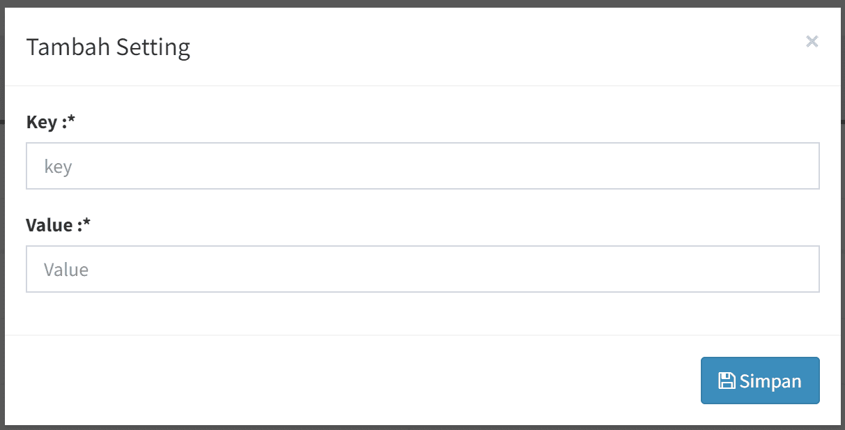 Pada form tambah setting silahkan memasukkan data Key, Value dan tekan tombol Simpan