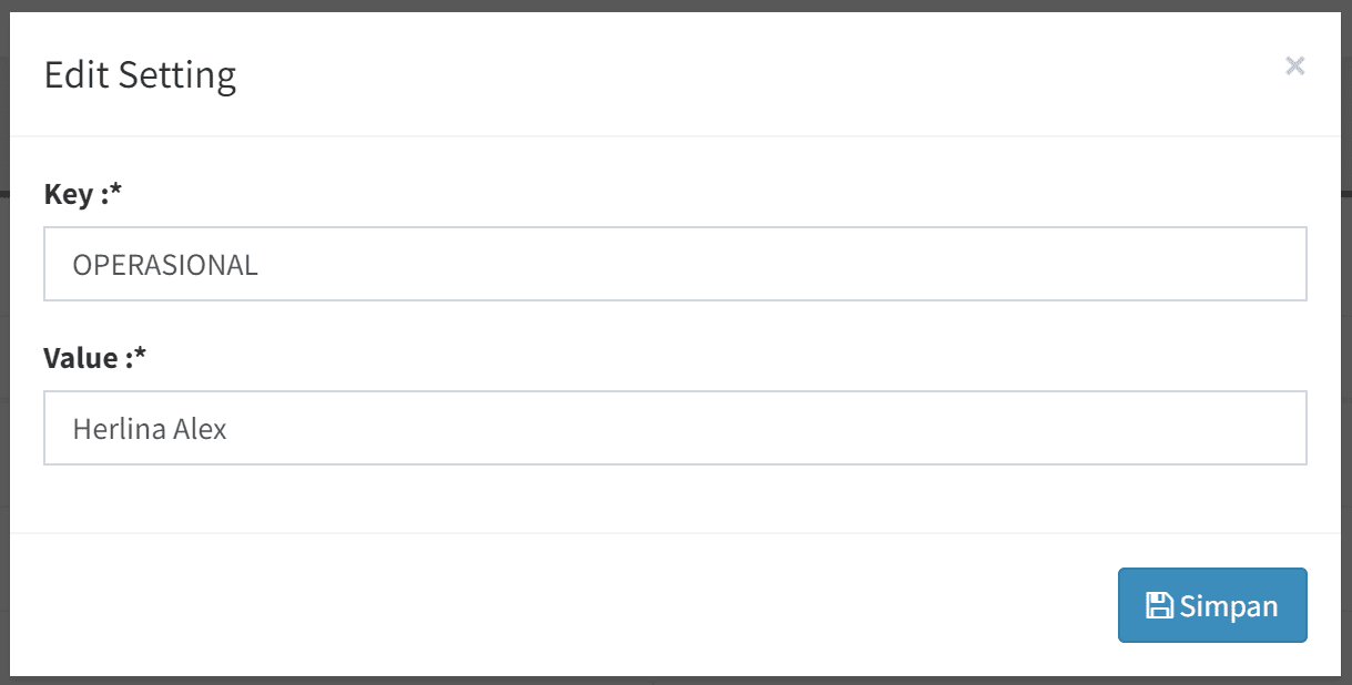 Pada form edit setting silahkan ubah data Key, Value dan tekan tombol Simpan