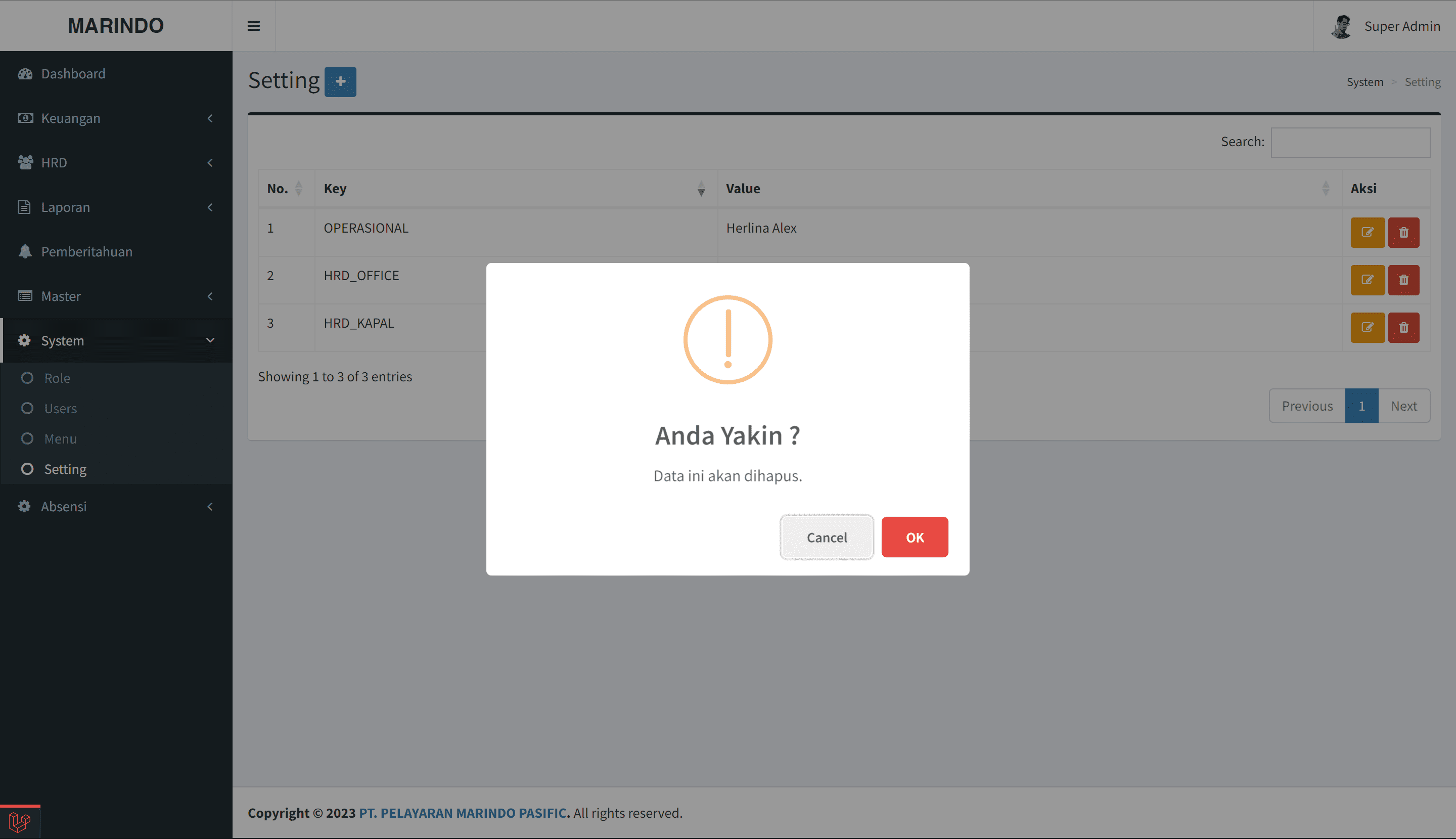Modul setting berisi data-data setting yang terdapat di marindo :
