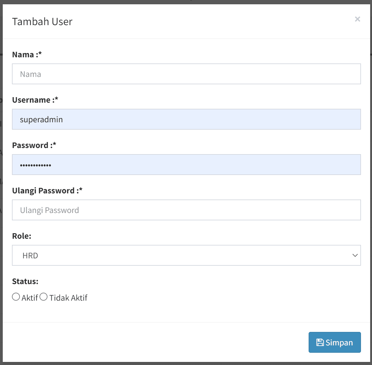 Pada form tambah user silahkan memasukkan data Nama Lengkap, Username, Password, Ulangi Password, Role, dan Status (Optional) dan tekan tombol Simpan